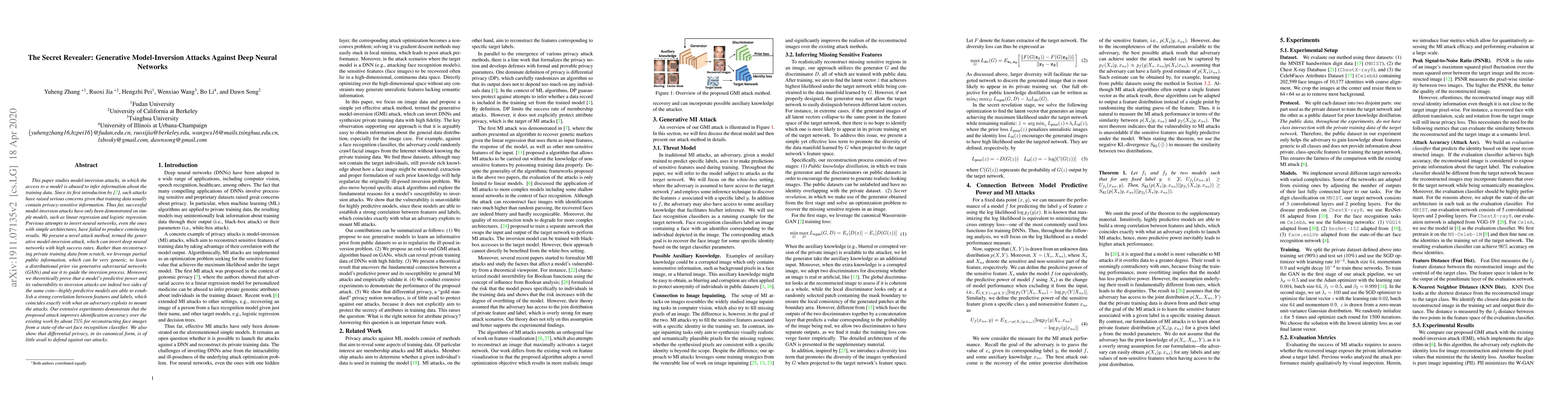 This paper introduces a novel generative model-inversion attack that successfully inverts deep neural networks, significantly improving upon previous attempts. The method leverages partial public information and generative adversarial networks to guide the inversion process, demonstrating a 75% improvement in accuracy for reconstructing face images.