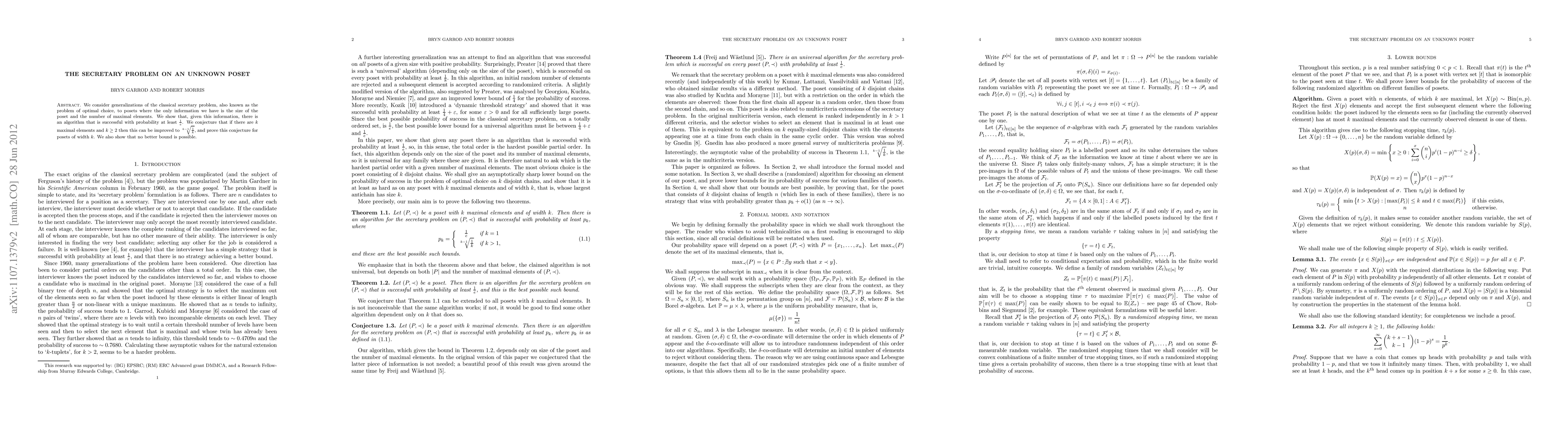 This paper generalizes the secretary problem to partially ordered sets (posets) with limited information, demonstrating an algorithm that succeeds with a probability of at least $\frac{1}{e}$. It conjectures and proves a better bound for posets with $k \geq 2$ maximal elements, specifically $\sqrt[k-1]{\frac{1}{k}}$ for posets of width $k$.