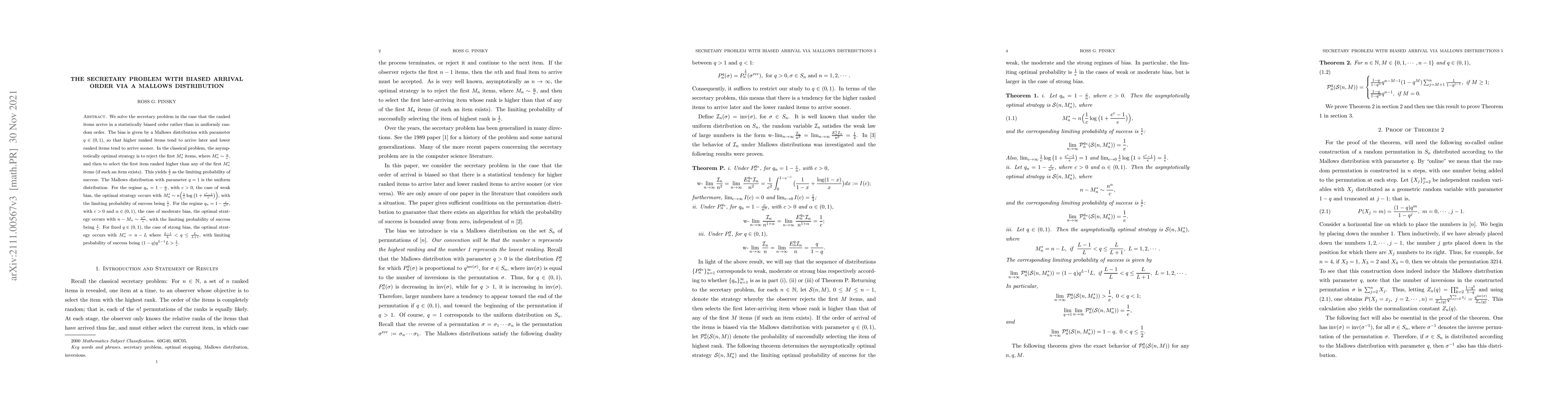This research paper presents solutions to the secretary problem with biased item arrival, modeled by a Mallows distribution with parameter q. The optimal strategy and success probability are derived for different bias regimes: weak (qn ~ 1-c/n), moderate (qn ~ 1-c/n^α, α∈(0,1)), and strong (fixed q∈(0,1)). The limiting probability of success remains 1/e for weak and moderate biases, while for strong biases, it depends on the specific q value and threshold L.