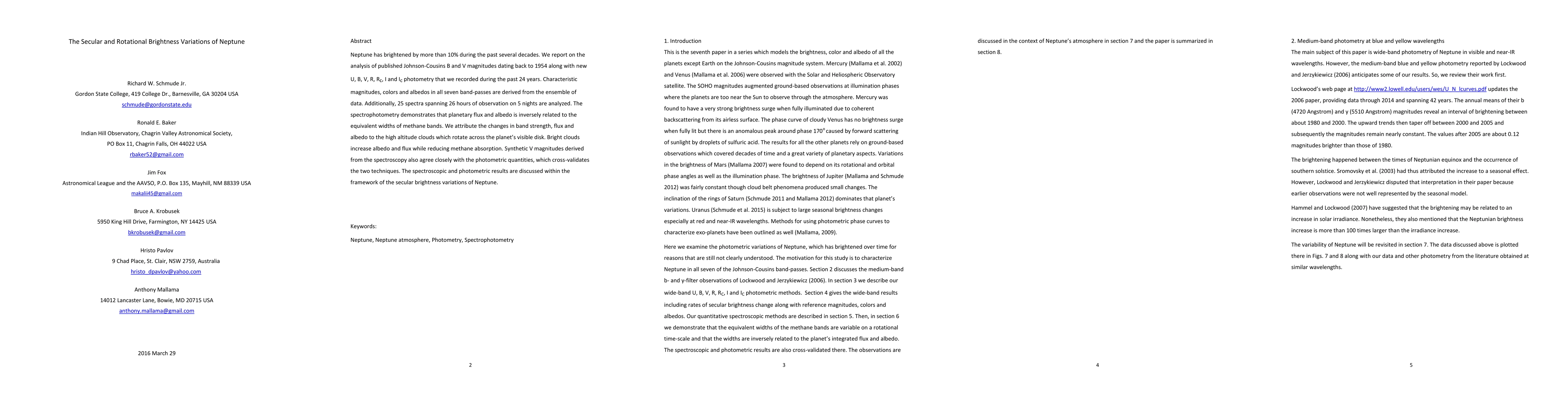 Neptune has brightened by more than 10% during the past several decades. We report on the analysis of published Johnson-Cousins B and V magnitudes dating back to 1954 along with new U, B, V, R, Rc, I and Ic photometry that we recorded during the past 24 years. Characteristic magnitudes, colors and albedos in all seven band-passes are derived from the ensemble of data. Additionally, 25 spectra spanning 26 hours of observation on 5 nights are analyzed. The spectrophotometry demonstrates that planetary flux and albedo is inversely related to the equivalent widths of methane bands. We attribute the changes in band strength, flux and albedo to the high altitude clouds which rotate across the planet's visible disk. Bright clouds increase albedo and flux while reducing methane absorption. Synthetic V magnitudes derived from the spectroscopy also agree closely with the photometric quantities, which cross-validates the two techniques. The spectroscopic and photometric results are discussed within the framework of the secular brightness variations of Neptune.