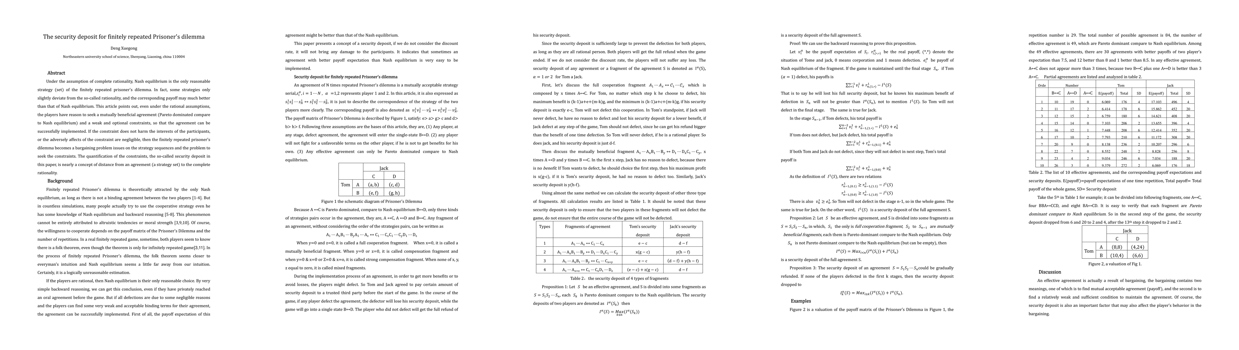 Under the assumption of complete rationality, Nash equilibrium is the only reasonable strategy (set) of the finitely repeated prisoner's dilemma. In fact, some strategies only slightly deviate from the so-called rationality, and the corresponding payoff may much better than that of Nash equilibrium. This article points out, even under the rational assumptions, the players have reason to seek a mutually beneficial agreement (Pareto dominated compare to Nash equilibrium) and a weak and optional constraints, so that the agreement can be successfully implemented. If the constraint does not harm the interests of the participants, or the adversely affects of the constraint are negligible, then the finitely repeated prisoner's dilemma becomes a bargaining problem issues on the strategy sequences and the problem to seek the constraints. The quantification of the constraints, the so-called security deposit in this paper, is nearly a concept of distance from an agreement (a strategy set) to the complete rationality.