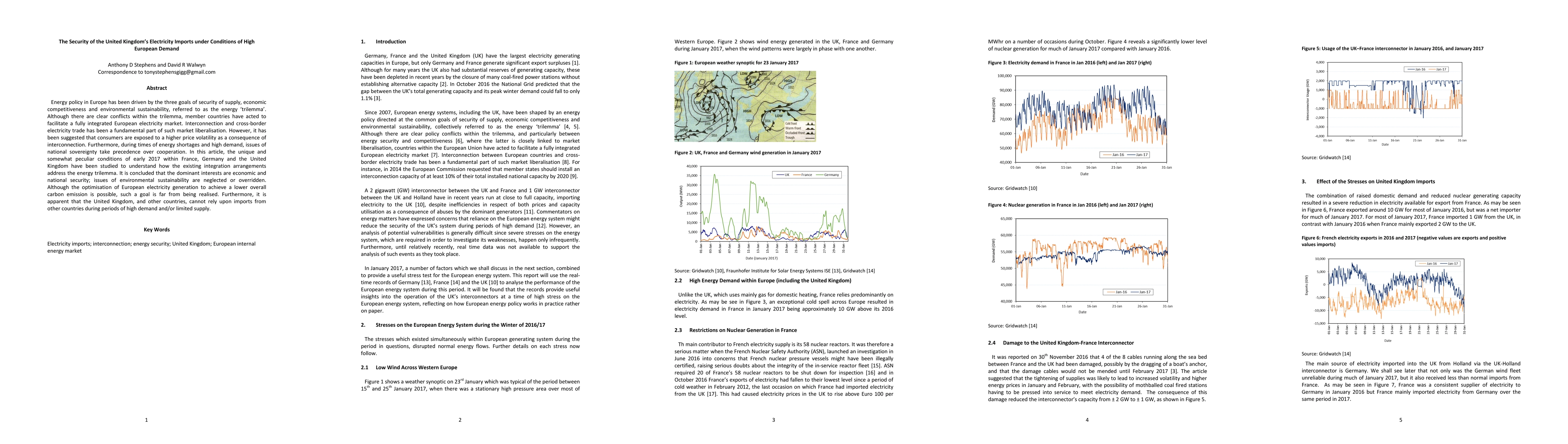 Energy policy in Europe has been driven by the three goals of security of supply, economic competitiveness and environmental sustainability, referred to as the energy trilemma. Although there are clear conflicts within the trilemma, member countries have acted to facilitate a fully integrated European electricity market. Interconnection and cross-border electricity trade has been a fundamental part of such market liberalisation. However, it has been suggested that consumers are exposed to a higher price volatility as a consequence of interconnection. Furthermore, during times of energy shortages and high demand, issues of national sovereignty take precedence over cooperation. In this article, the unique and somewhat peculiar conditions of early 2017 within France, Germany and the United Kingdom have been studied to understand how the existing integration arrangements address the energy trilemma. It is concluded that the dominant interests are economic and national security; issues of environmental sustainability are neglected or overridden. Although the optimisation of European electricity generation to achieve a lower overall carbon emission is possible, such a goal is far from being realised. Furthermore, it is apparent that the United Kingdom, and other countries, cannot rely upon imports from other countries during periods of high demand and/or limited supply.