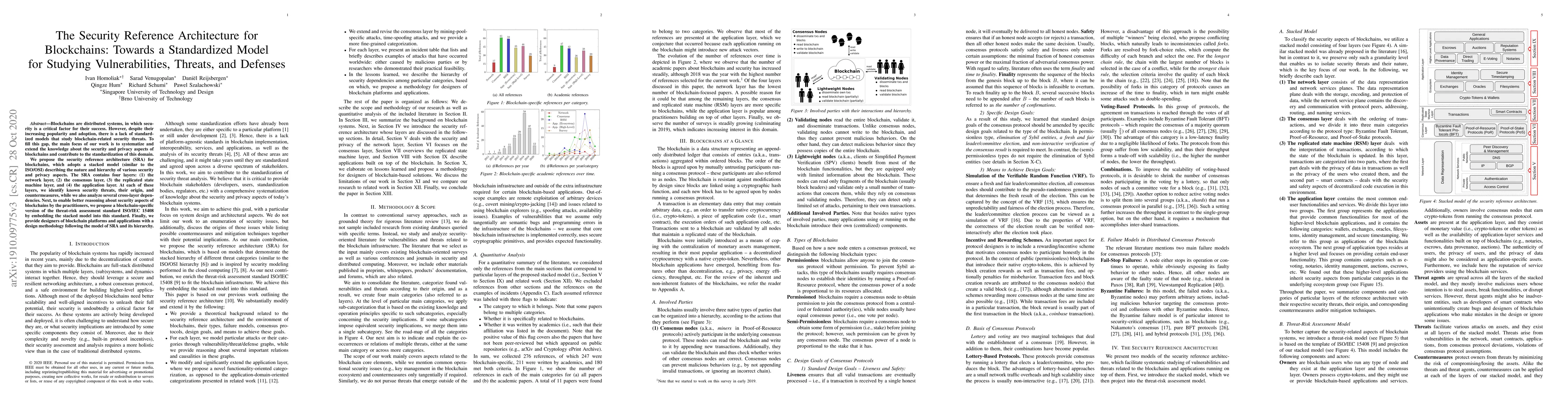 This paper proposes a security reference architecture (SRA) for blockchains to standardize the study of blockchain-related security threats, vulnerabilities, and defenses. The SRA includes four layers and identifies threats, origins, and countermeasures at each, aiming to enhance security reasoning and provide a design methodology for blockchain platforms.