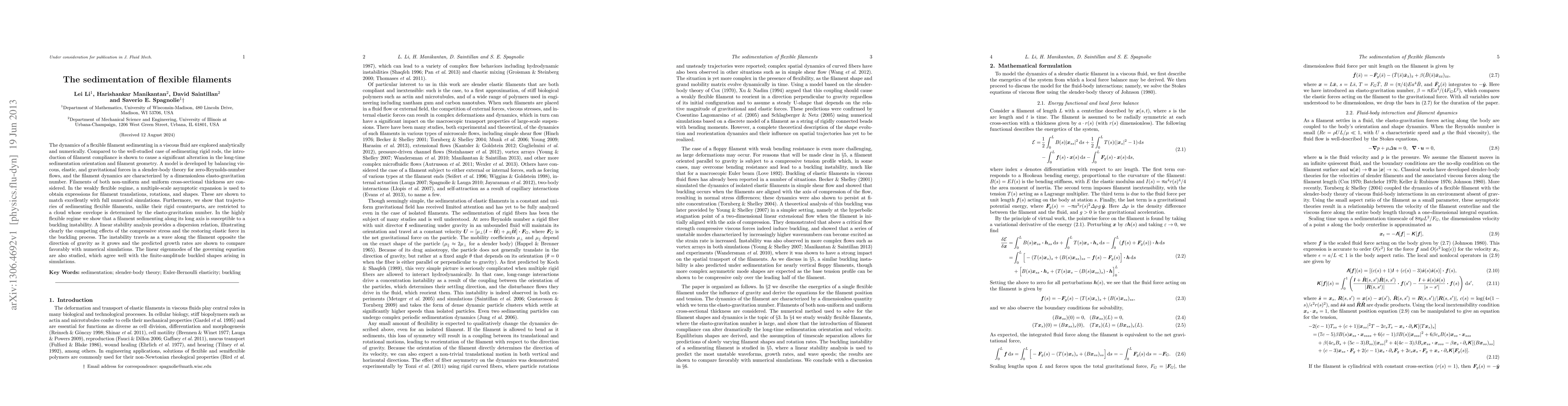 This paper analytically and numerically investigates the sedimentation dynamics of flexible filaments in viscous fluids, revealing significant differences from rigid rods due to filament compliance. It develops a model balancing viscous, elastic, and gravitational forces, showing that flexible filaments exhibit unique buckling instabilities and trajectories constrained by an elasto-gravitation number.