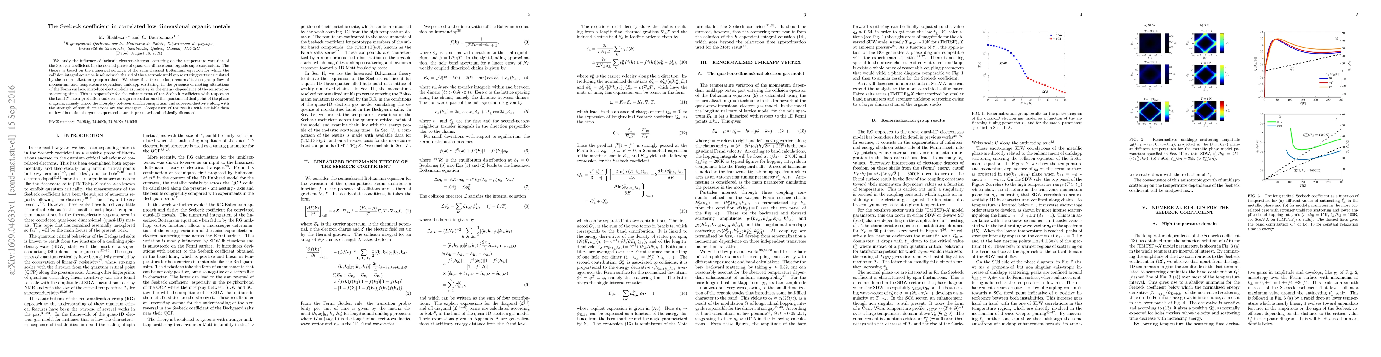 This paper investigates how inelastic electron-electron scattering affects the temperature dependence of the Seebeck coefficient in quasi-one-dimensional organic superconductors. The study reveals that momentum and temperature-dependent umklapp scattering, especially near quantum critical points, leads to an electron-hole asymmetry that enhances the Seebeck coefficient and can even reverse its sign.
