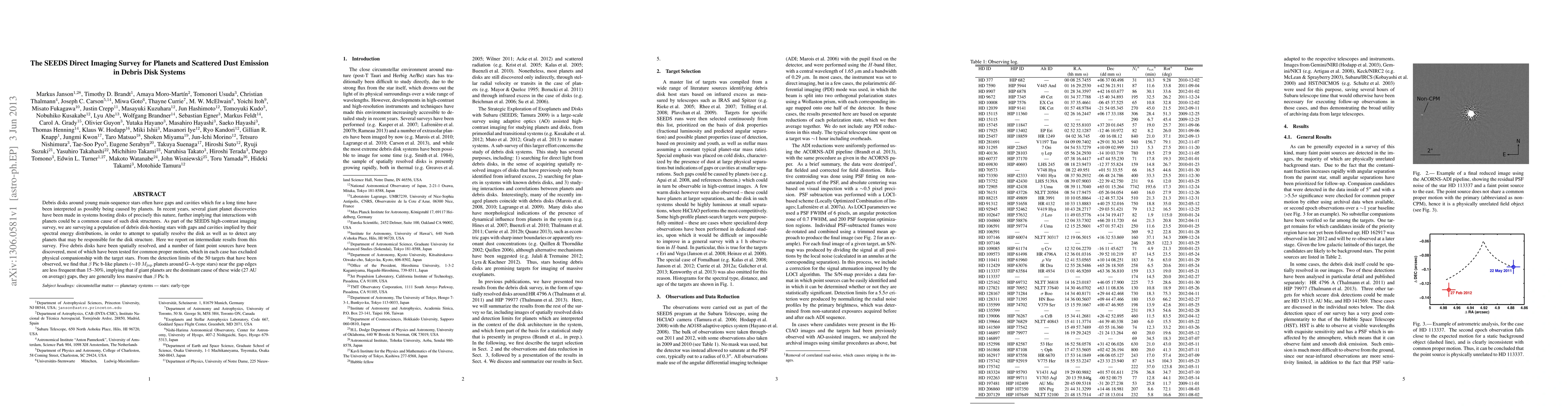The SEEDS Direct Imaging Survey aims to detect planets in debris disks around young stars, finding that gaps and cavities are less likely caused by beta Pic b-like planets, suggesting that if planets are responsible, they tend to be less massive. Five debris disks have been resolved, and no nearby companions were found among faint point sources.