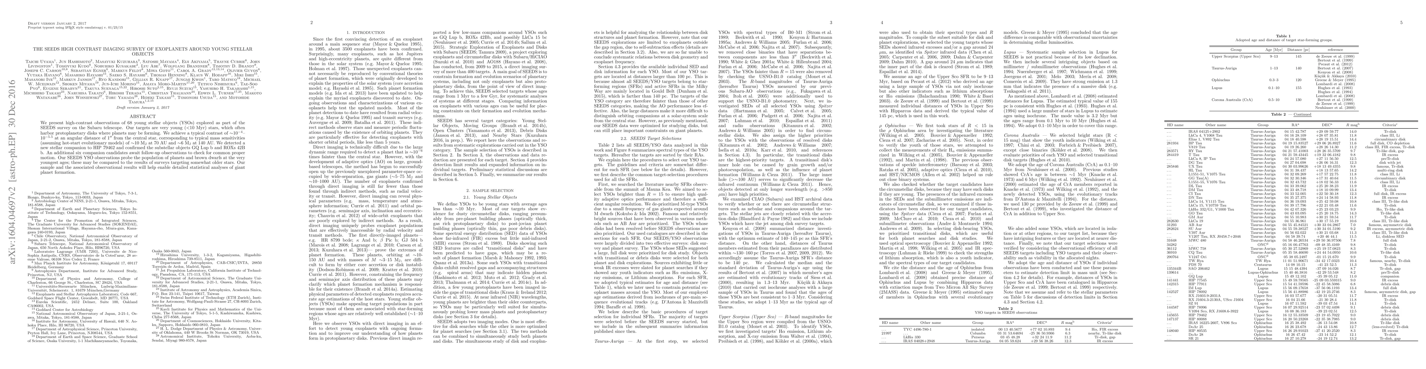The SEEDS survey on the Subaru telescope conducted high-contrast imaging of 68 young stellar objects, detecting a new stellar companion and confirming two substellar objects, while probing the population of planets and brown dwarfs in the earliest stages of formation. These findings will aid in statistical analyses of giant planet formation.