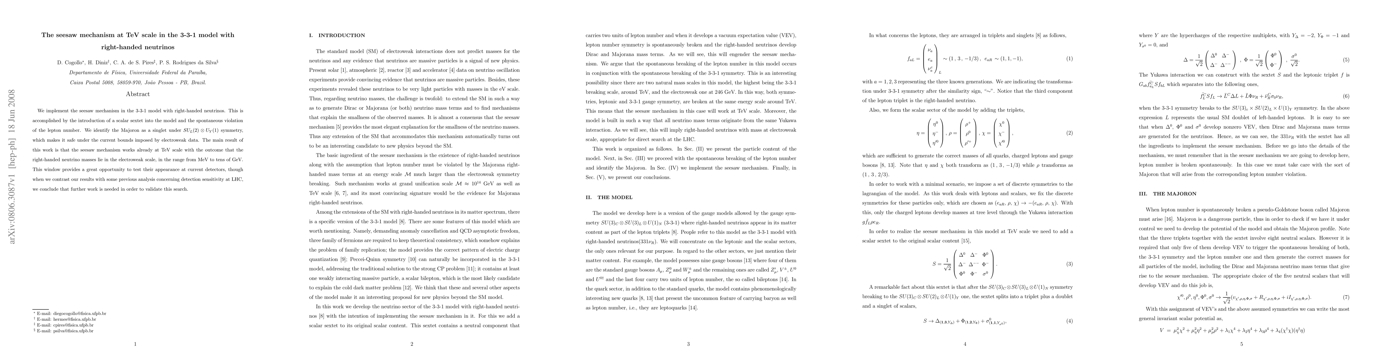 We implement the seesaw mechanism in the 3-3-1 model with right-handed neutrinos. This is accomplished by the introduction of a scalar sextet into the model and the spontaneous violation of the lepton number. We identify the Majoron as a singlet under $SU_L(2)\otimes U_Y(1)$ symmetry, which makes it safe under the current bounds imposed by electroweak data. The main result of this work is that the seesaw mechanism works already at TeV scale with the outcome that the right-handed neutrino masses lie in the electroweak scale, in the range from MeV to tens of GeV. This window provides a great opportunity to test their appearance at current detectors, though when we contrast our results with some previous analysis concerning detection sensitivity at LHC, we conclude that further work is needed in order to validate this search.