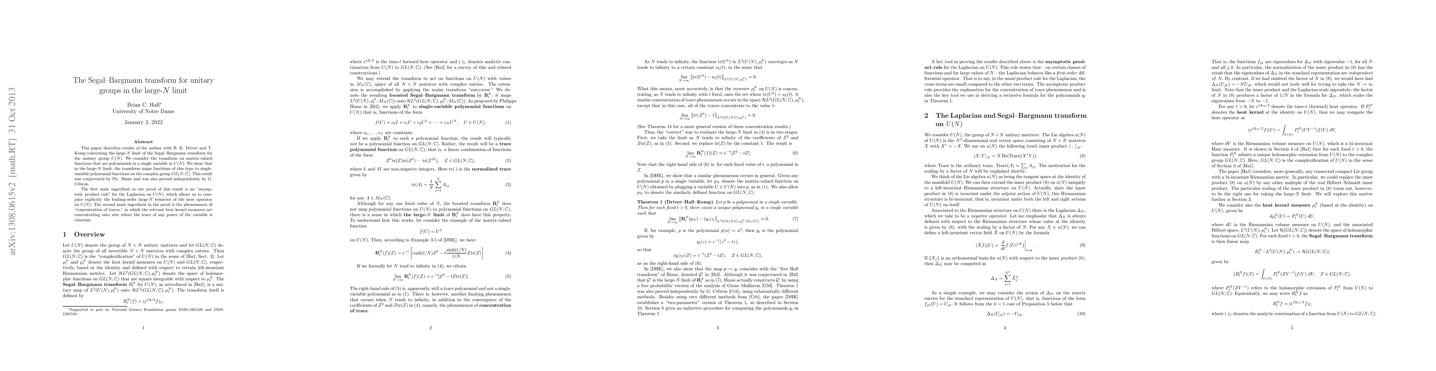 This paper describes results of the author with B. K. Driver and T. Kemp concerning the large-N limit of the Segal--Bargmann transform for the unitary group U(N). We consider the transform on matrix-valued functions that are polynomials in a single variable in U(N). We show that in the large-N limit, the transform maps functions of this type to single-variable polynomial functions on the complex group GL(N;C). This result was conjectured by Ph. Biane and was also proved independently by G. C\'ebron. The first main ingredient in our proof of this result is an "asymptotic product rule" for the Laplacian on U(N), which allows us to compute explicitly the leading-order large-N behavior of the heat operator on U(N). The second main ingredient in the proof is the phenomenon of "concentration of traces," in which the relevant heat kernel measures are concentrating onto sets where the trace of any power of the variable is constant.
