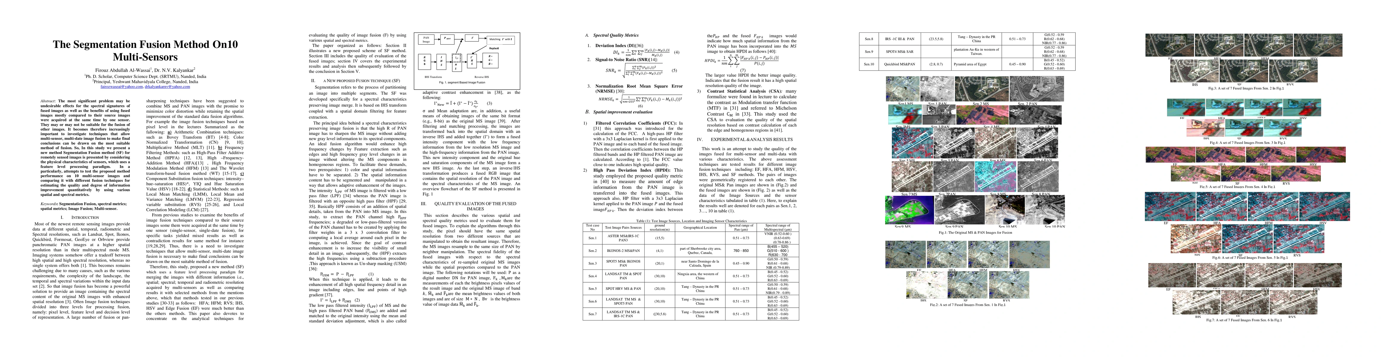 The most significant problem may be undesirable effects for the spectral signatures of fused images as well as the benefits of using fused images mostly compared to their source images were acquired at the same time by one sensor. They may or may not be suitable for the fusion of other images. It becomes therefore increasingly important to investigate techniques that allow multi-sensor, multi-date image fusion to make final conclusions can be drawn on the most suitable method of fusion. So, In this study we present a new method Segmentation Fusion method (SF) for remotely sensed images is presented by considering the physical characteristics of sensors, which uses a feature level processing paradigm. In a particularly, attempts to test the proposed method performance on 10 multi-sensor images and comparing it with different fusion techniques for estimating the quality and degree of information improvement quantitatively by using various spatial and spectral metrics.