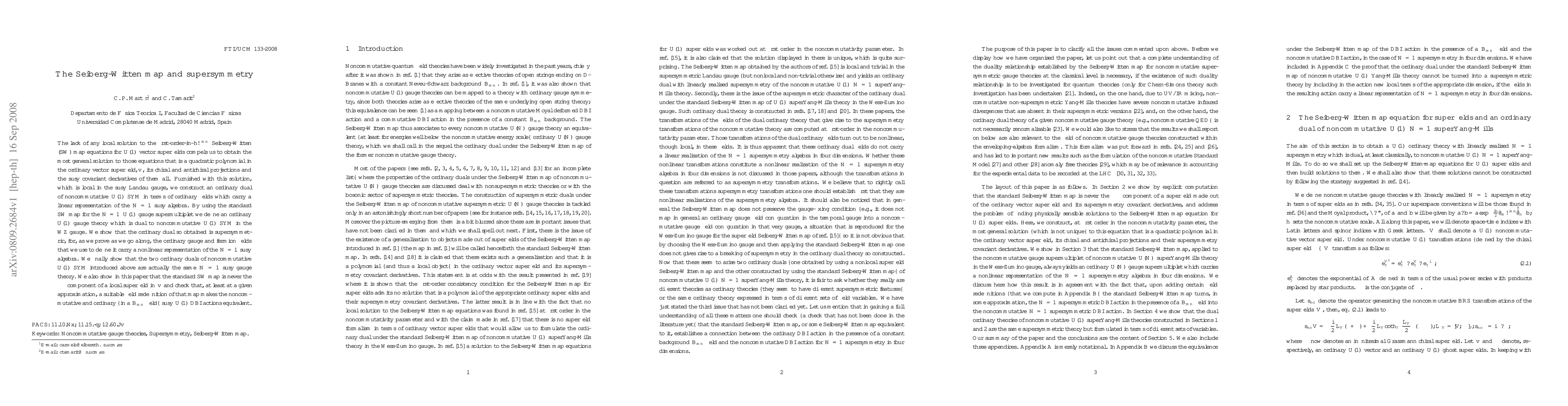 The lack of any local solution to the first-order-in-h omegamn Seiberg-Witten (SW) map equations for U(1) vector superfields compels us to obtain the most general solution to those equations that is a quadratic polynomial in the ordinary vector superfield, v, its chiral and antichiral projections and the susy covariant derivatives of them all. Furnished with this solution, which is local in the susy Landau gauge, we construct an ordinary dual of noncommutative U(1) SYM in terms of ordinary fields which carry a linear representation of the N=1 susy algebra. By using the standard SW map for the N=1 U(1) gauge supermultiplet we define an ordinary U(1) gauge theory which is dual to noncommutative U(1) SYM in the WZ gauge. We show that the ordinary dual so obtained is supersymmetric, for, as we prove as we go along, the ordinary gauge and fermion fields that we use to define it carry a nonlinear representation of the N=1 susy algebra. We finally show that the two ordinary duals of noncommutative U(1) SYM introduced above are actually the same N=1 susy gauge theory. We also show in this paper that the standard SW map is never the theta theta--bar component of a local superfield in v and check that, at least at a given approximation, a suitable field redefinition of that map makes the noncommutative and ordinary --in a Bmn field-- susy U(1) DBI actions equivalent.