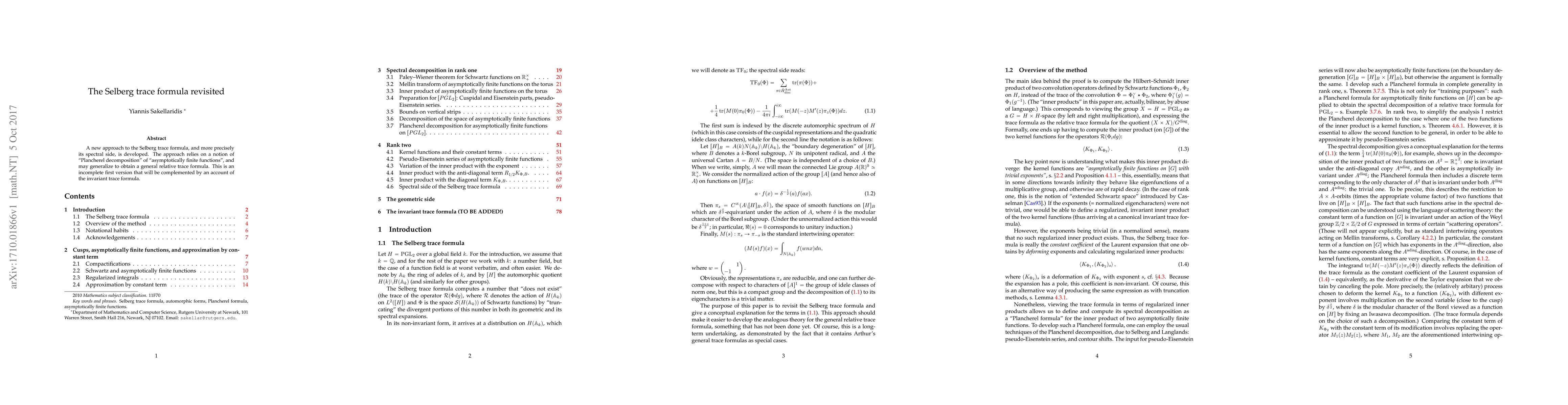 The paper introduces a novel method for the Selberg trace formula focusing on its spectral side, using a "Plancherel decomposition" of asymptotically finite functions, and hints at its potential generalization for a relative trace formula. This initial version is incomplete and will be supplemented with a detailed account of the invariant trace formula.