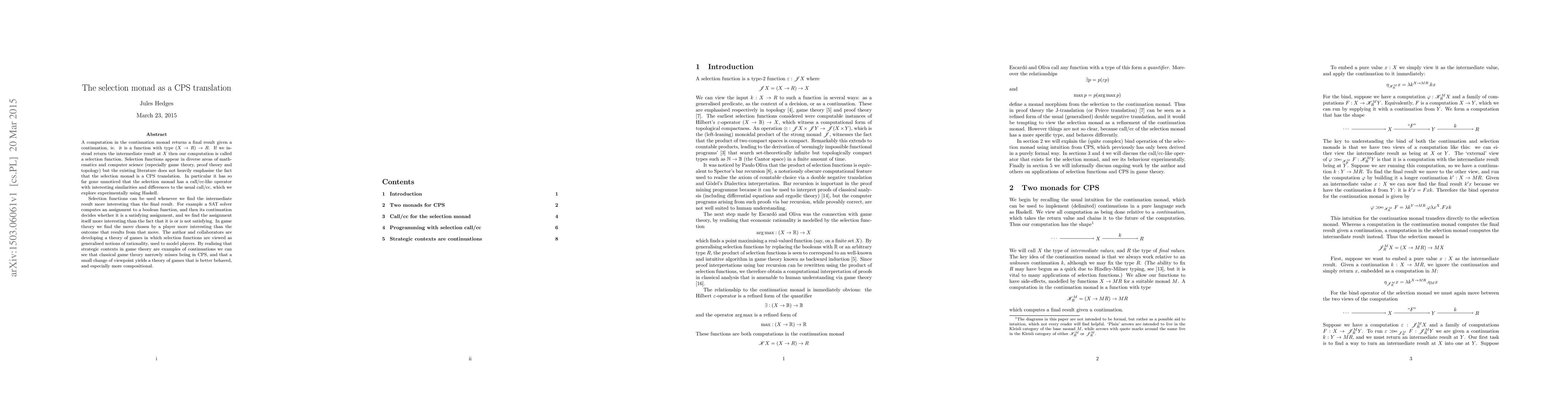 A computation in the continuation monad returns a final result given a continuation, ie. it is a function with type $(X \to R) \to R$. If we instead return the intermediate result at $X$ then our computation is called a selection function. Selection functions appear in diverse areas of mathematics and computer science (especially game theory, proof theory and topology) but the existing literature does not heavily emphasise the fact that the selection monad is a CPS translation. In particular it has so far gone unnoticed that the selection monad has a call/cc-like operator with interesting similarities and differences to the usual call/cc, which we explore experimentally using Haskell. Selection functions can be used whenever we find the intermediate result more interesting than the final result. For example a SAT solver computes an assignment to a boolean function, and then its continuation decides whether it is a satisfying assignment, and we find the assignment itself more interesting than the fact that it is or is not satisfying. In game theory we find the move chosen by a player more interesting than the outcome that results from that move. The author and collaborators are developing a theory of games in which selection functions are viewed as generalised notions of rationality, used to model players. By realising that strategic contexts in game theory are examples of continuations we can see that classical game theory narrowly misses being in CPS, and that a small change of viewpoint yields a theory of games that is better behaved, and especially more compositional.
