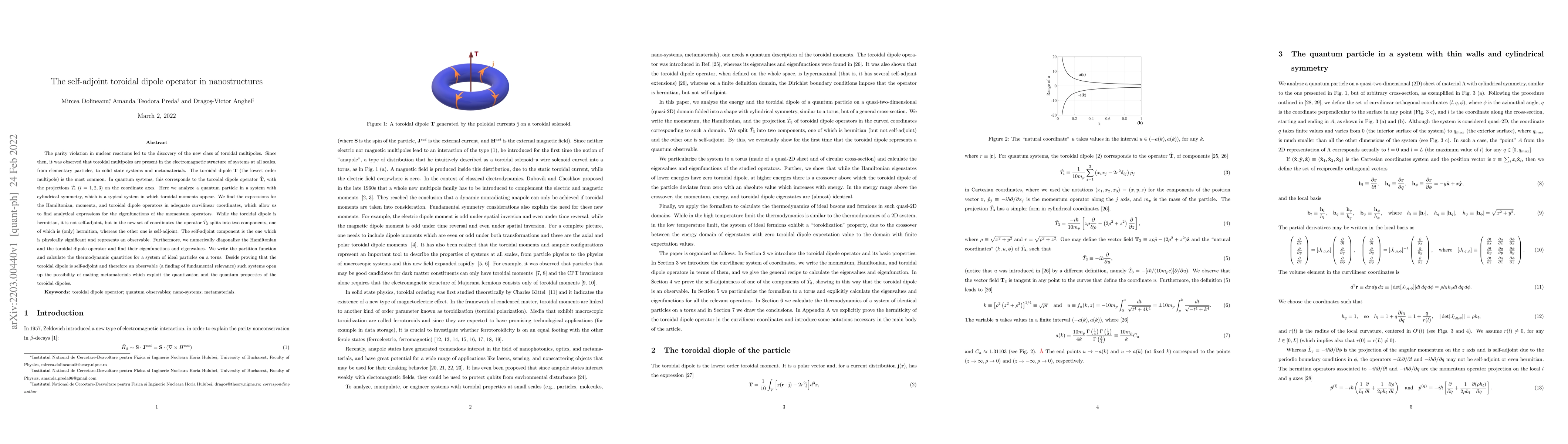 The parity violation in nuclear reactions led to the discovery of the new class of toroidal multipoles. Since then, it was observed that toroidal multipoles are present in the electromagnetic structure of systems at all scales, from elementary particles, to solid state systems and metamaterials. The toroidal dipole ${\bf T}$ (the lowest order multipole) is the most common. In quantum systems, this corresponds to the toroidal dipole operator $\hat{\bf T}$, with the projections $\hat{T}_i$ ($i=1,2,3$) on the coordinate axes. Here we analyze a quantum particle in a system with cylindrical symmetry, which is a typical system in which toroidal moments appear. We find the expressions for the Hamiltonian, momenta, and toroidal dipole operators in adequate curvilinear coordinates, which allow us to find analytical expressions for the eigenfunctions of the momentum operators. While the toroidal dipole is hermitian, it is not self-adjoint, but in the new set of coordinates the operator $\hat{T}_3$ splits into two components, one of which is (only) hermitian, whereas the other one is self-adjoint. The self-adjoint component is the one that is physically significant and represents an observable. Furthermore, we numerically diagonalize the Hamiltonian and the toroidal dipole operator and find their eigenfunctions and eigenvalues. We write the partition function and calculate the thermodynamic quantities for a system of ideal particles on a torus. Besides proving that the toroidal dipole is self-adjoint and therefore an observable (a finding of fundamental relevance) such systems open up the possibility of making metamaterials that exploit the quantization and the quantum properties of the toroidal dipoles.