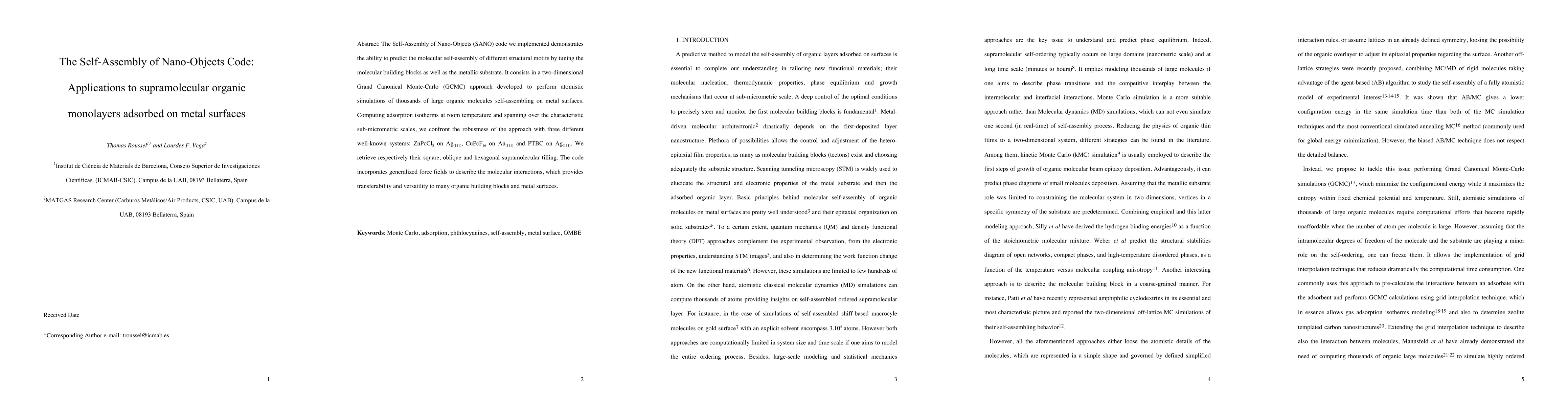 The SANO code predicts the self-assembly of organic molecules on metal surfaces using a two-dimensional Grand Canonical Monte-Carlo approach, successfully modeling the supramolecular tiling of ZnPcCl8, CuPcF16, and PTBC on respective metal substrates. The code's generalized force fields enable versatile simulations across various organic and metallic systems.