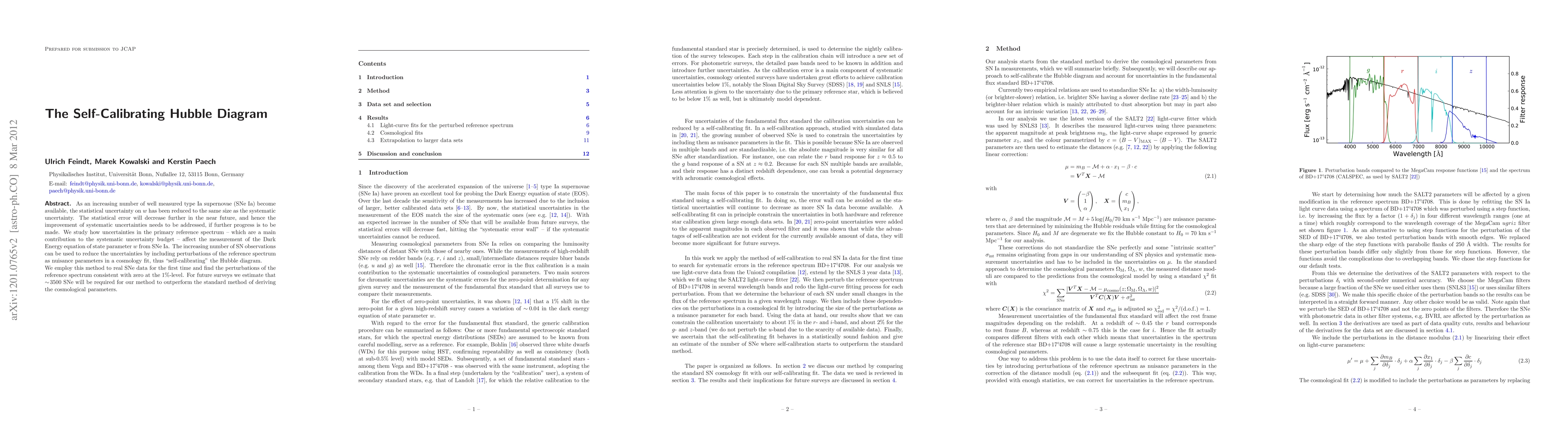 As an increasing number of well measured type Ia supernovae (SNe Ia) become available, the statistical uncertainty on w has been reduced to the same size as the systematic uncertainty. The statistical error will decrease further in the near future, and hence the improvement of systematic uncertainties needs to be addressed, if further progress is to be made. We study how uncertainties in the primary reference spectrum - which are a main contribution to the systematic uncertainty budget - affect the measurement of the Dark Energy equation of state parameter w from SNe Ia. The increasing number of SN observations can be used to reduce the uncertainties by including perturbations of the reference spectrum as nuisance parameters in a cosmology fit, thus "self-calibrating" the Hubble diagram. We employ this method to real SNe data for the first time and find the perturbations of the reference spectrum consistent with zero at the 1%-level. For future surveys we estimate that ~3500 SNe will be required for our method to outperform the standard method of deriving the cosmological parameters.
