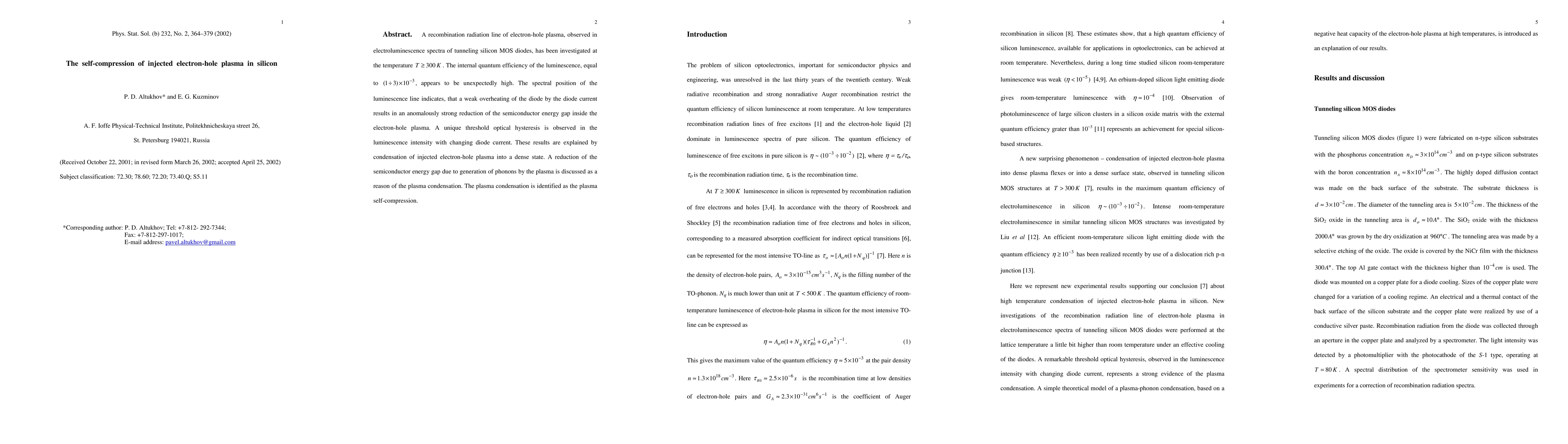 This paper investigates the recombination radiation of electron-hole plasma in silicon MOS diodes at temperatures above 300 K, revealing unexpectedly high internal quantum efficiency. The study finds that the semiconductor energy gap reduces significantly due to plasma self-compression, leading to unique threshold optical hysteresis in luminescence intensity.