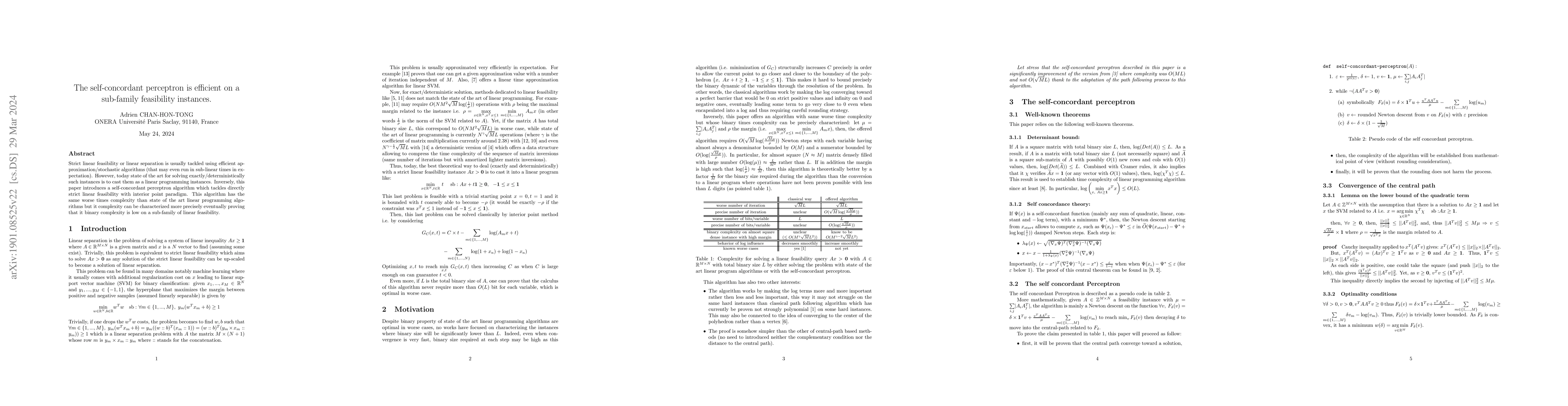 The paper introduces a self-concordant perceptron algorithm for solving strict linear feasibility problems, demonstrating comparable worst-case time complexity to linear programming but with more precise characterization and lower binary complexity on a specific sub-family of instances.