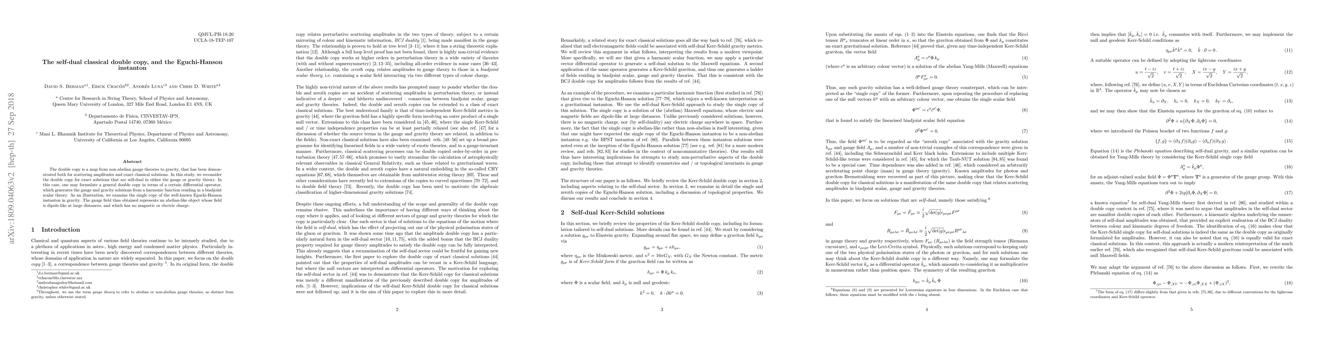 This paper explores the self-dual classical double copy structure, revealing a differential operator that generates gauge and gravity solutions from a biadjoint scalar theory. It specifically examines the Eguchi-Hanson instanton, showing that its gauge counterpart is a dipole-like field with no magnetic or electric charge.
