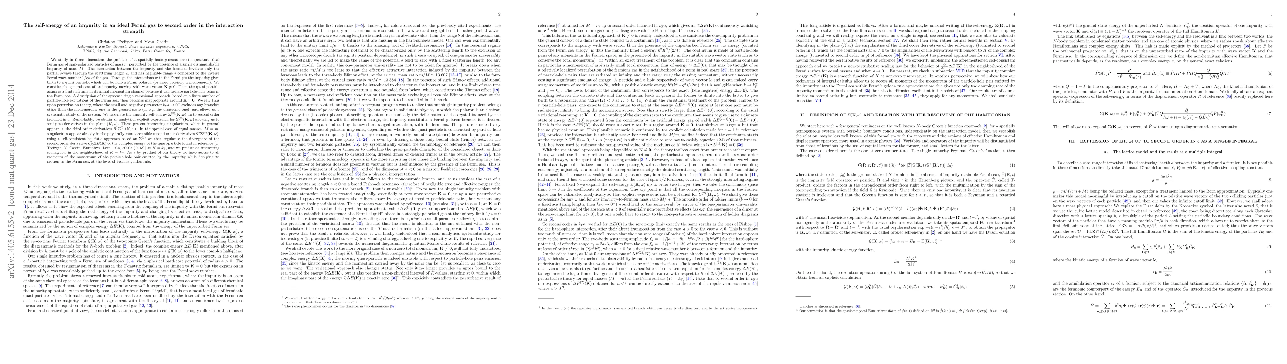 We study in three dimensions the problem of a spatially homogeneous zero-temperature ideal Fermi gas of spin-polarized particles of mass $m$ perturbed by the presence of a single distinguishable impurity of mass $M$. The interaction between the impurity and the fermions involves only the partial $s$-wave through the scattering length $a$, and has negligible range $b$ compared to the inverse Fermi wave number $1/\kf$ of the gas. Through the interactions with the Fermi gas the impurity gives birth to a quasi-particle, which will be here a Fermi polaron (or more precisely a {\sl monomeron}). We consider the general case of an impurity moving with wave vector $\KK\neq\OO$: Then the quasi-particle acquires a finite lifetime in its initial momentum channel because it can radiate particle-hole pairs in the Fermi sea. A description of the system using a variational approach, based on a finite number of particle-hole excitations of the Fermi sea, then becomes inappropriate around $\KK=\mathbf{0}$. We rely thus upon perturbation theory, where the small and negative parameter $\kf a\to0^-$ excludes any branches other than the monomeronic one in the ground state (as e.g.\ the dimeronic one), and allows us a systematic study of the system. We calculate the impurity self-energy $\Sigma^{(2)}(\KK,\omega)$ up to second order included in $a$. Remarkably, we obtain an analytical explicit expression for $\Sigma^{(2)}(\KK,\omega)$ allowing us to study its derivatives in the plane $(K,\omega)$. These present interesting singularities, which in general appear in the third order derivatives $\partial^3 \Sigma^{(2)}(\KK,\omega)$. In the special case of equal masses, $M=m$, singularities appear already in the physically more accessible second order derivatives $\partial^2 \Sigma^{(2)}(\KK,\omega)$; using a self-consistent heuristic approach based on $\Sigma^{(2)}$ we then regularise the divergence of the second order derivative $\partial\_K^2 \Delta E(\KK)$ of the complex energy of the quasi-particle found in reference [C. Trefzger, Y. Castin, Europhys. Lett. {\bf 104}, 50005 (2013)] at $K=\kf$, and we predict an interesting scaling law in the neighborhood of $K=\kf$. As a by product of our theory we have access to all moments of the momentum of the particle-hole pair emitted by the impurity while damping its motion in the Fermi sea, at the level of Fermi's golden rule.