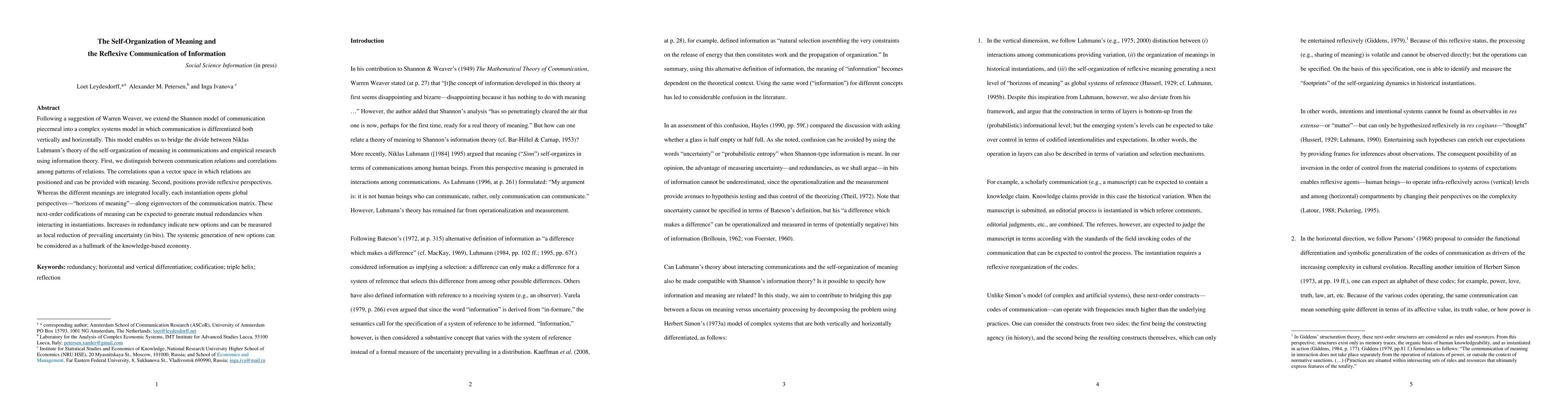 This paper extends Shannon's communication model into a complex systems framework, bridging Luhmann's theory of self-organization of meaning with information theory. It highlights the reflexive communication of information through the generation of new options and reductions in uncertainty, marking a key feature of the knowledge-based economy.