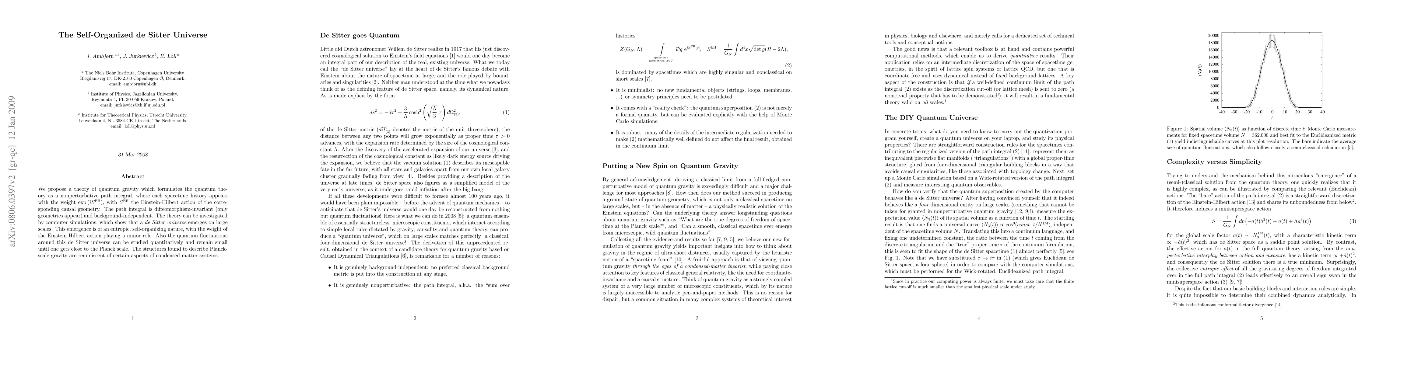 We propose a theory of quantum gravity which formulates the quantum theory as a nonperturbative path integral, where each spacetime history appears with a weight given by the exponentiated Einstein-Hilbert action of the corresponding causal geometry. The path integral is diffeomorphism-invariant (only geometries appear) and background-independent. The theory can be investigated by computer simulations, which show that a de Sitter universe emerges on large scales. This emergence is of an entropic, self-organizing nature, with the weight of the Einstein-Hilbert action playing a minor role. Also the quantum fluctuations around this de Sitter universe can be studied quantitatively and remain small until one gets close to the Planck scale. The structures found to describe Planck-scale gravity are reminiscent of certain aspects of condensed-matter systems.