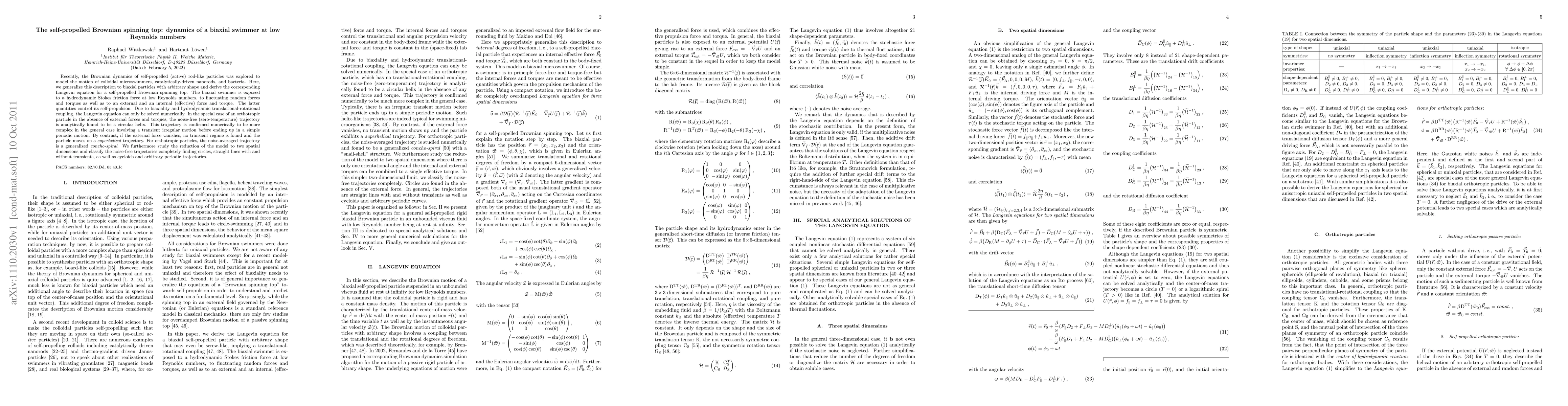 This paper explores the dynamics of a self-propelled biaxial Brownian spinning top modeled by a generalized Langevin equation, focusing on low Reynolds number hydrodynamics. The study reveals complex trajectories, including circular helices and superhelical paths, influenced by internal and external forces, and confirms these findings through numerical simulations.