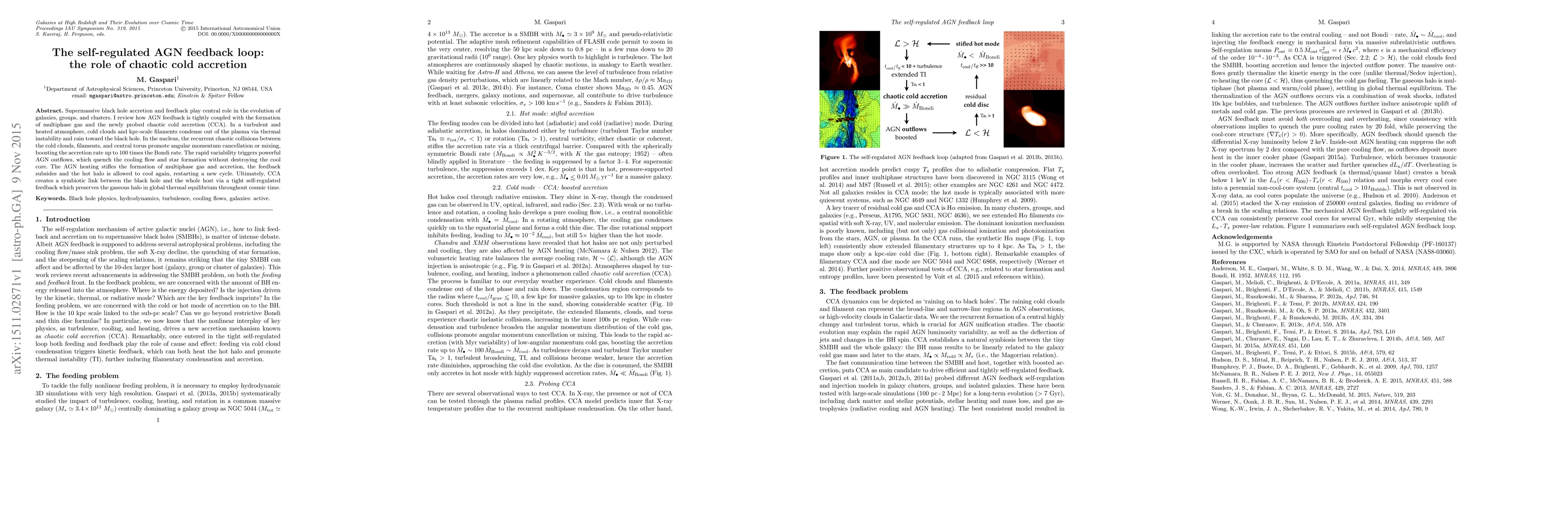 This paper reviews the self-regulated AGN feedback loop driven by chaotic cold accretion, where turbulent atmospheres promote the formation of cold clouds and filaments that boost accretion rates. The resulting AGN outflows quench cooling flows and star formation, maintaining the gaseous halo in thermal equilibrium.