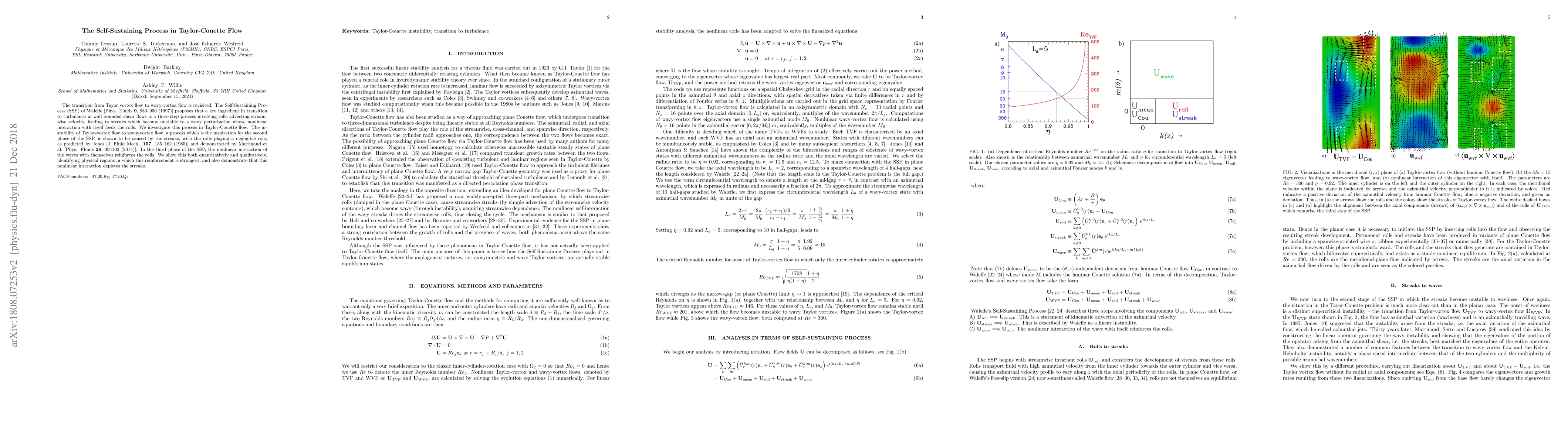 The transition from Tayor vortex flow to wavy-vortex flow is revisited. The Self-Sustaining Process (SSP) of Waleffe [Phys. Fluids 9, 883-900 (1997)] proposes that a key ingredient in transition to turbulence in wall-bounded shear flows is a three-step process involving rolls advecting streamwise velocity, leading to streaks which become unstable to a wavy perturbation whose nonlinear interaction with itself feeds the rolls. We investigate this process in Taylor-Couette flow. The instability of Taylor-vortex flow to wavy-vortex flow, a process which is the inspiration for the second phase of the SSP, is shown to be caused by the streaks, with the rolls playing a negligible role, as predicted by Jones [J. Fluid Mech. 157, 135-162 (1985)] and demonstrated by Martinand et al. [Phys. Fluids 26, 094102 (2014)]. In the third phase of the SSP, the nonlinear interaction of the waves with themselves reinforces the rolls. We show this both quantitatively and qualitatively, identifying physical regions in which this reinforcement is strongest, and also demonstrate that this nonlinear interaction depletes the streaks.