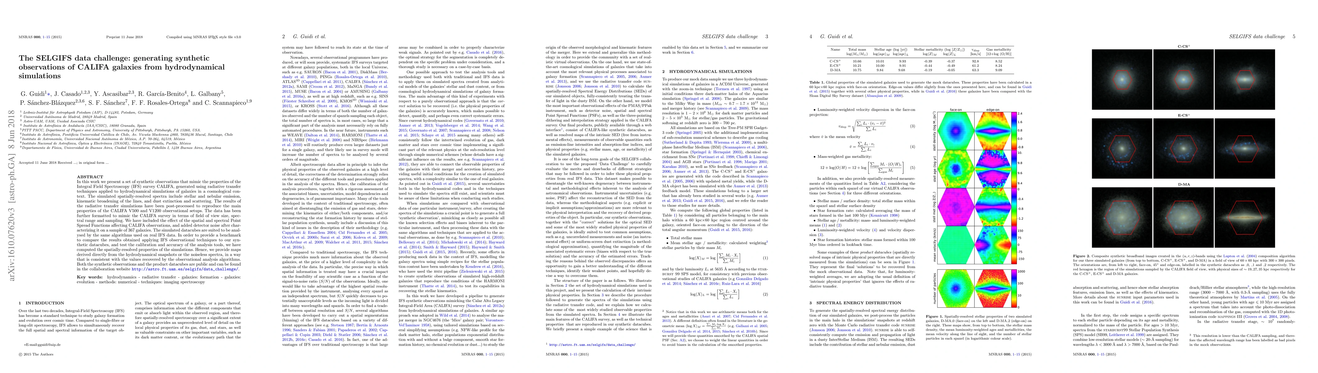 This paper presents synthetic observations mimicking the CALIFA Integral Field Spectroscopy survey, generated through radiative transfer applied to hydrodynamical simulations. The synthetic data includes detailed spatial and spectral properties, and is publicly available for benchmarking analysis tools against real IFS data.