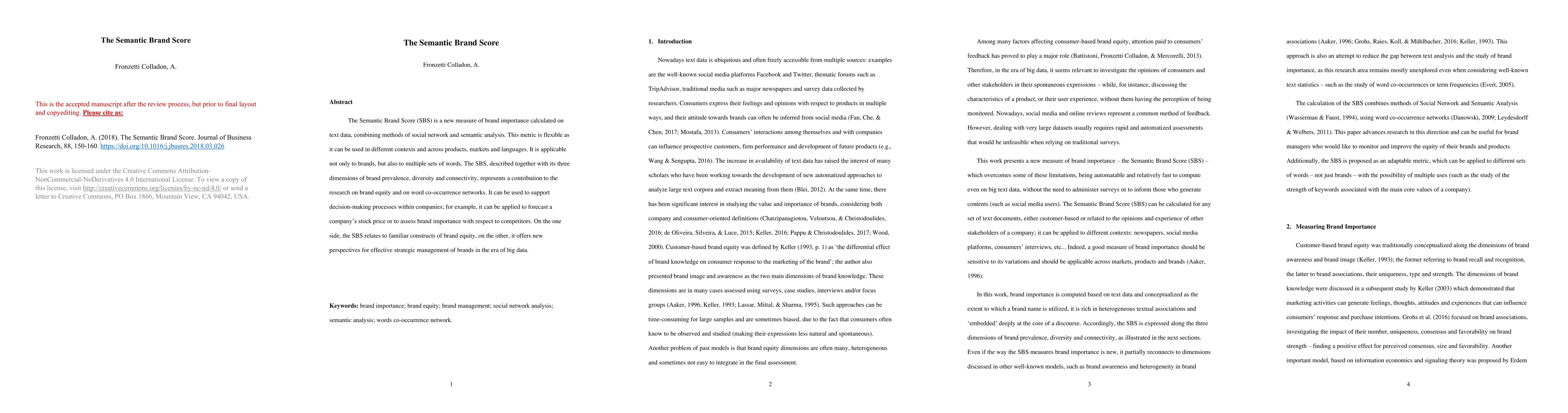 The Semantic Brand Score (SBS) is a new metric that calculates brand importance from text data, combining social network and semantic analysis methods. It offers flexible measurement across contexts, products, markets, and languages, providing insights for effective brand management in the era of big data.