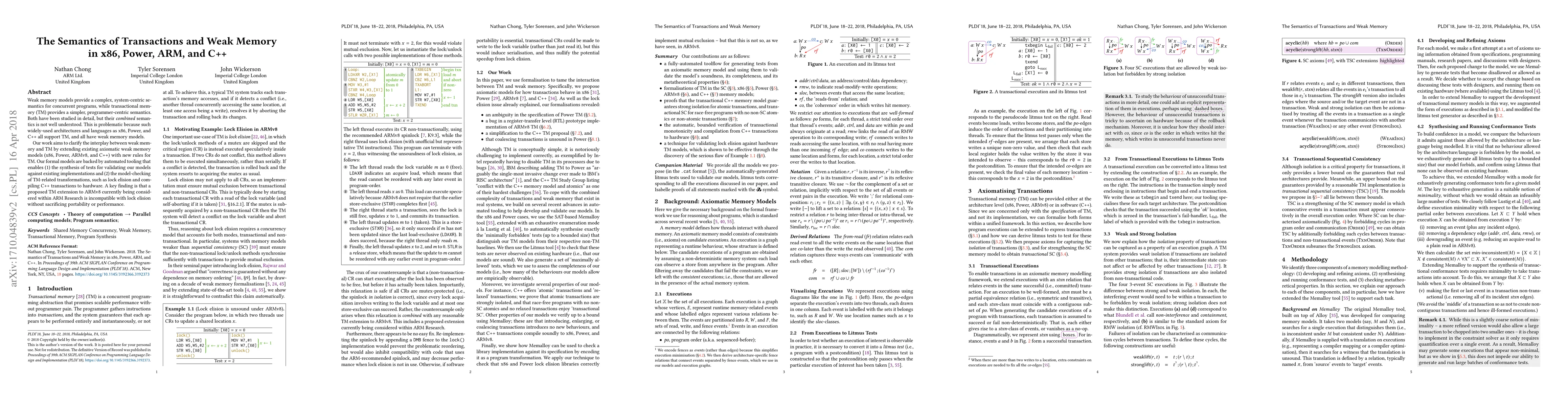 This paper investigates the semantics of transactional memory (TM) in the context of weak memory models in architectures like x86, Power, ARM, and C++. It proposes new rules to extend existing weak memory models to accommodate TM, supported by automated tools for validation and model-checking. A key result is that a proposed TM extension for ARMv8 conflicts with lock elision, risking portability or performance.