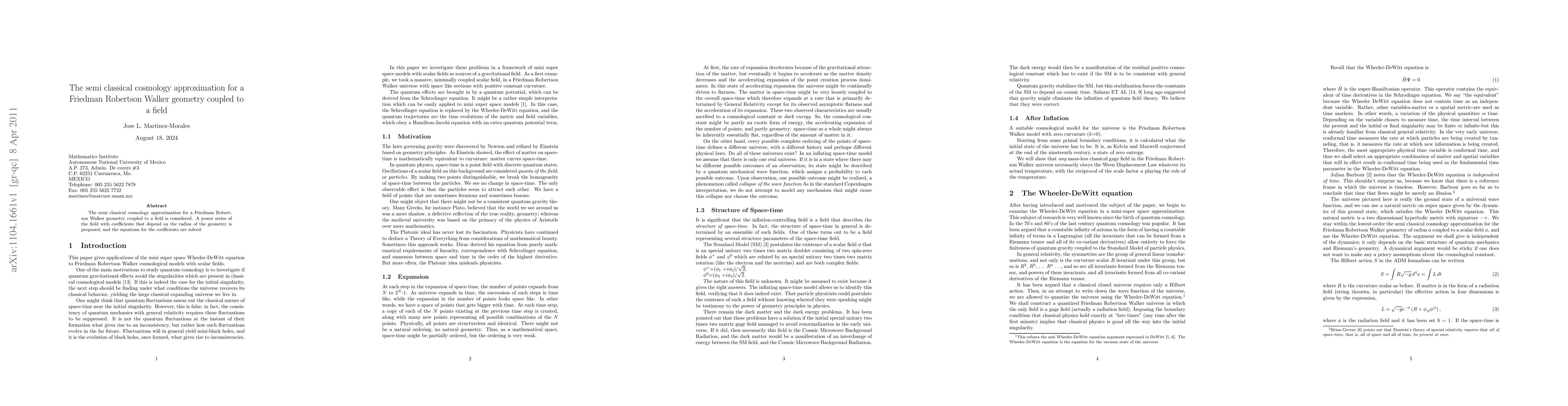 This paper explores the semiclassical cosmology approximation for a Friedman Robertson Walker (FRW) geometry coupled to a field, proposing a power series for the field with coefficients dependent on the geometry's radius, and solving the resulting equations for these coefficients.