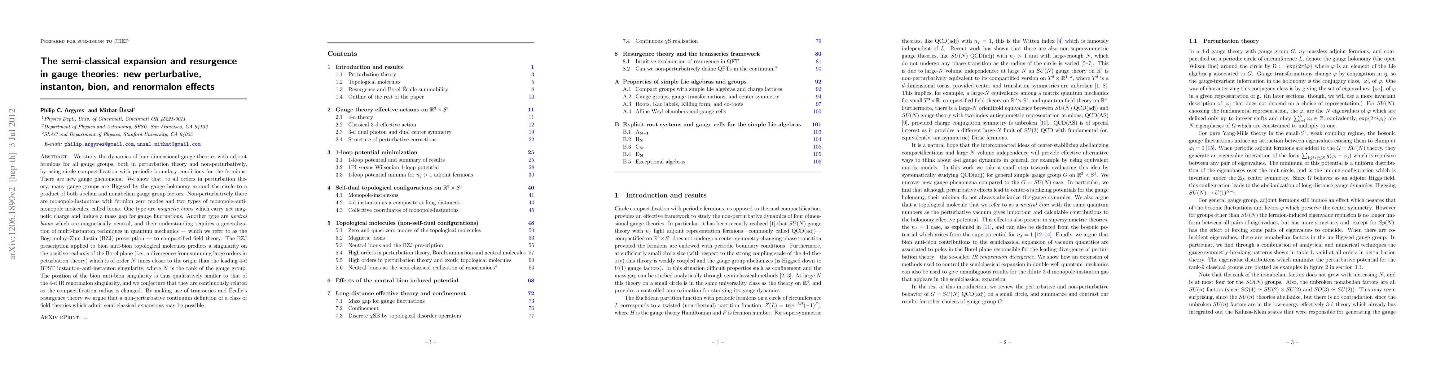 This paper explores the dynamics of four-dimensional gauge theories with adjoint fermions, revealing new gauge phenomena such as Higgsing and the existence of monopole-instantons and bions. It introduces the Bogomolny-Zinn-Justin prescription to understand neutral bions and uses resurgence theory to suggest a non-perturbative continuum definition for these field theories.