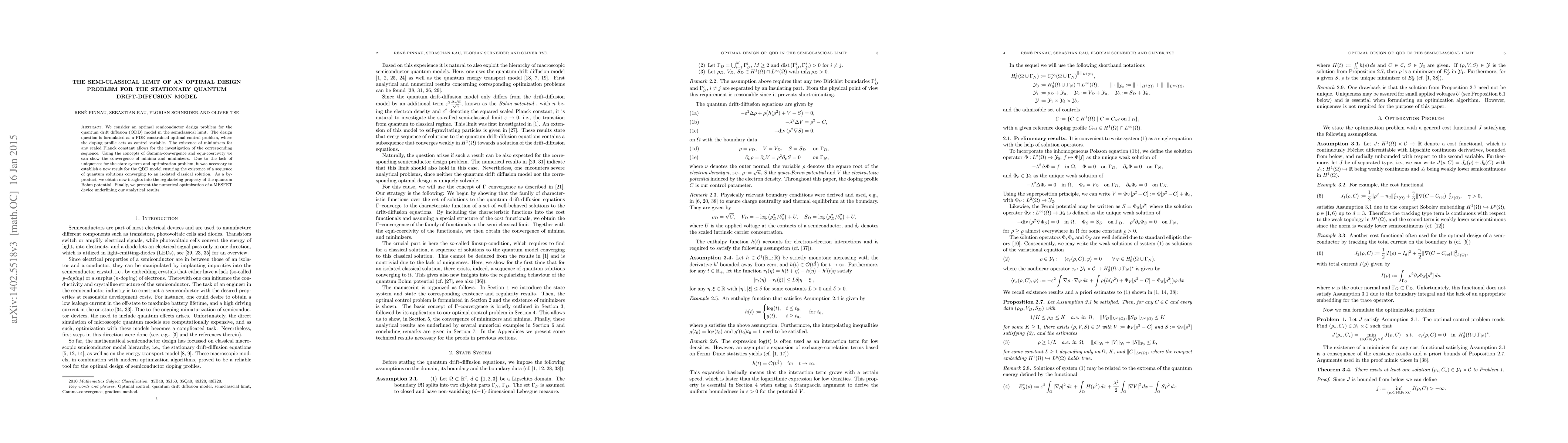 This paper investigates optimal semiconductor design for a quantum drift-diffusion model in its semi-classical limit, showing the convergence of minima and minimizers to classical solutions. The study provides new insights into the regularizing property of the quantum Bohm potential and demonstrates numerical optimization of a MESFET device.