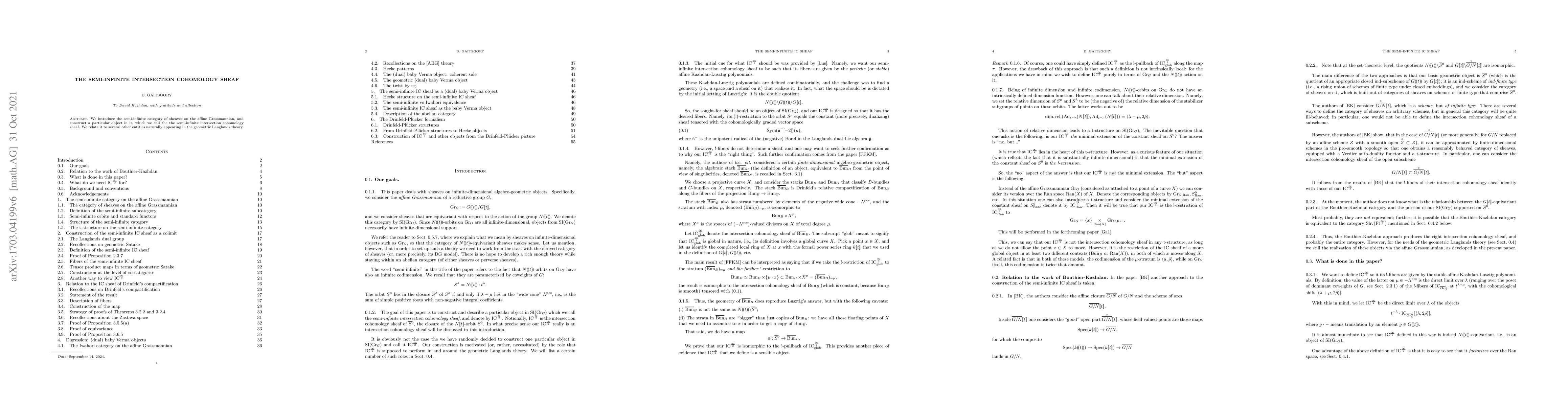 Summary: This paper introduces a semi-infinite category of sheaves on the affine Grassmannian and constructs a semi-infinite intersection cohomology sheaf, linking it to entities within geometric Langlands theory.
