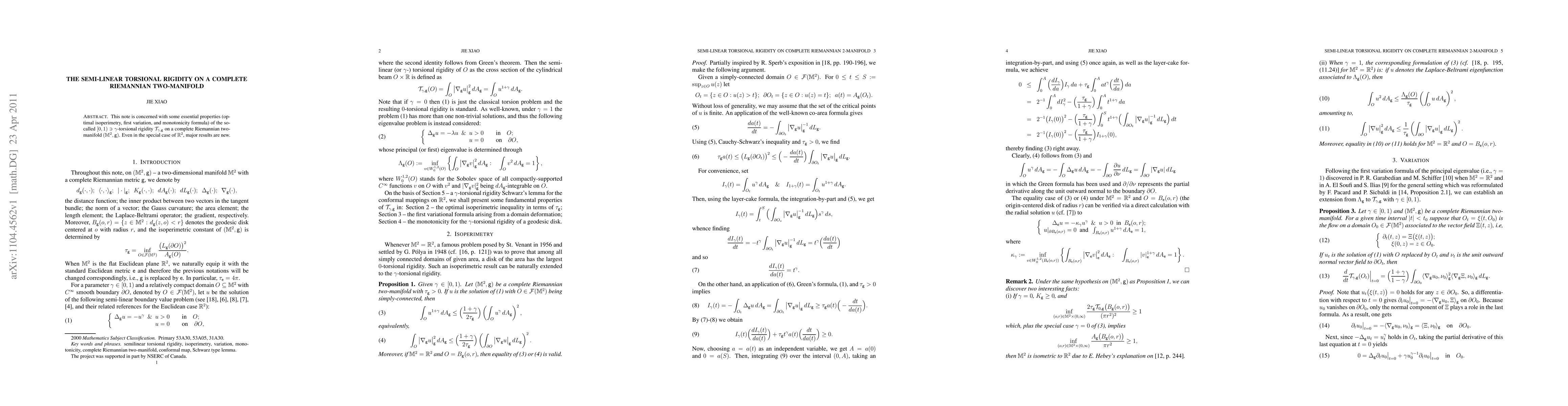 This research paper investigates the torsional rigidity of a complete Riemannian two-manifold, finding new results even in the special case of Euclidean space, focusing on properties such as optimal isoperimetry and monotonicity formulas.