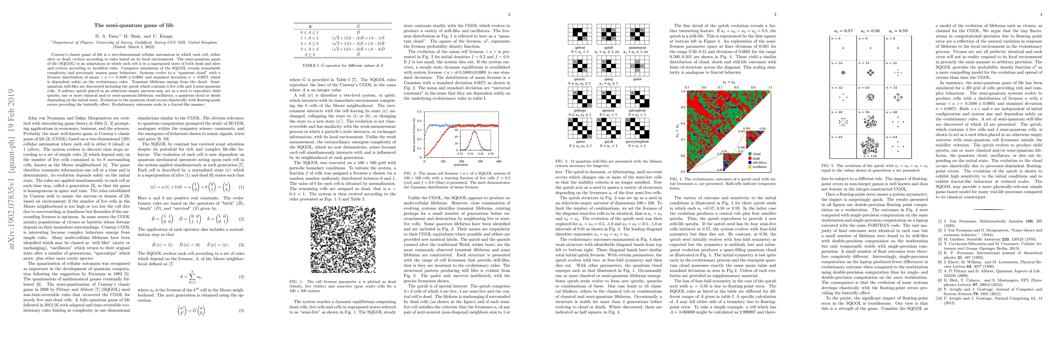 The semi-quantum game of life (SQGOL) introduces quantum superposition to Conway's game of life, resulting in complex behaviors and emergent lifeforms, including the "qutub," which can reproduce and lead to chaotic evolution patterns. The system evolves to a "quantum cloud" with a stable liveness distribution, showcasing fractal-like scaling.