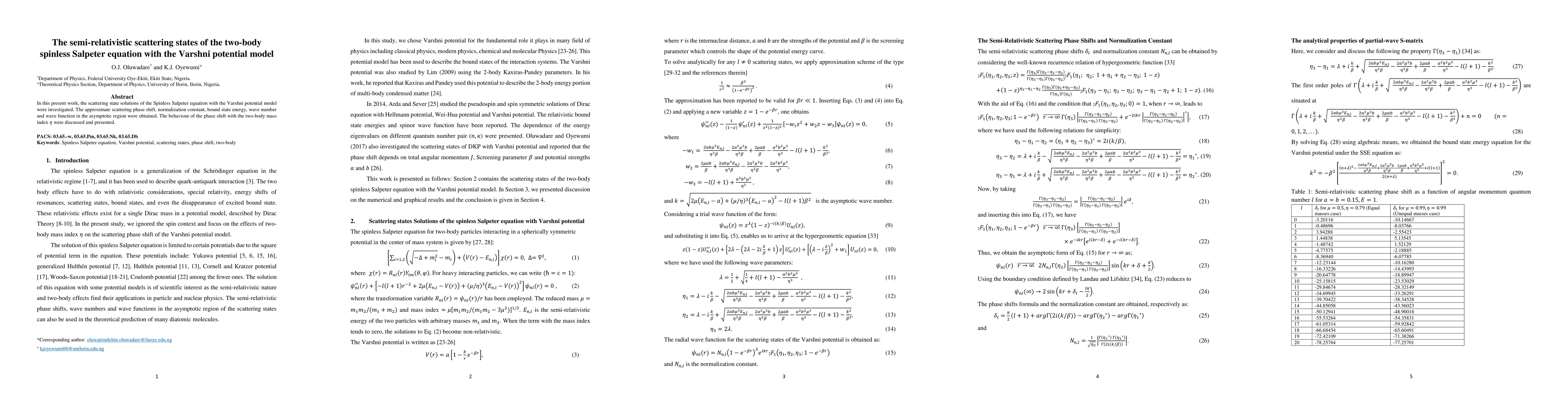 This paper explores the scattering states of the spinless Salpeter equation using the Varshni potential model, deriving the scattering phase shift, normalization constant, and bound state energy, and discusses the phase shift's dependence on the two-body mass index.