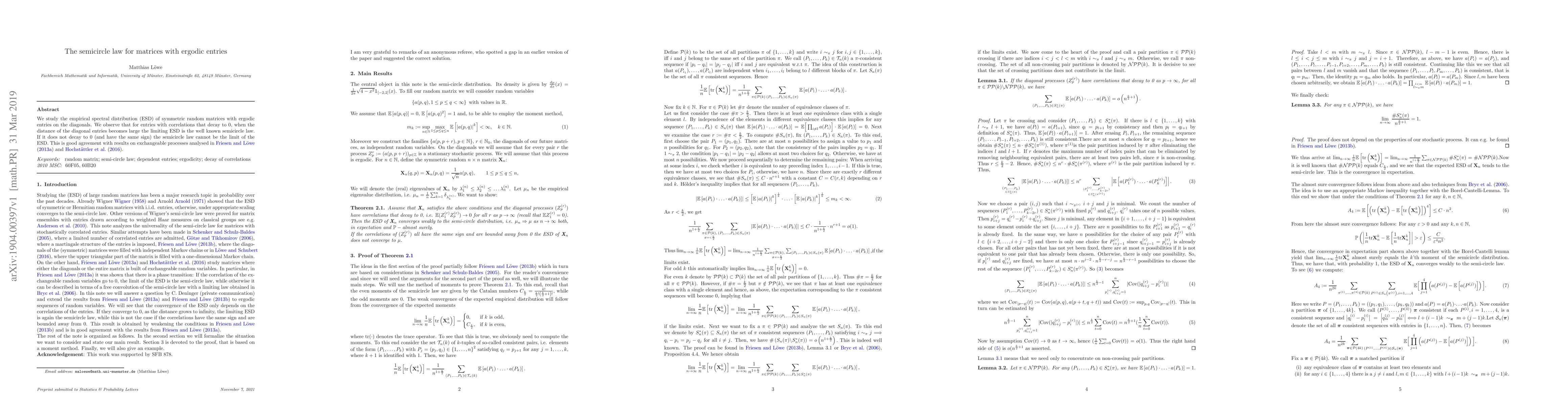 This paper investigates the empirical spectral distribution of symmetric random matrices with ergodic entries, showing that the semicircle law emerges when diagonal entries' correlations decay to zero. When correlations do not decay or maintain the same sign, the semicircle law does not apply, aligning with findings from exchangeable processes studies.