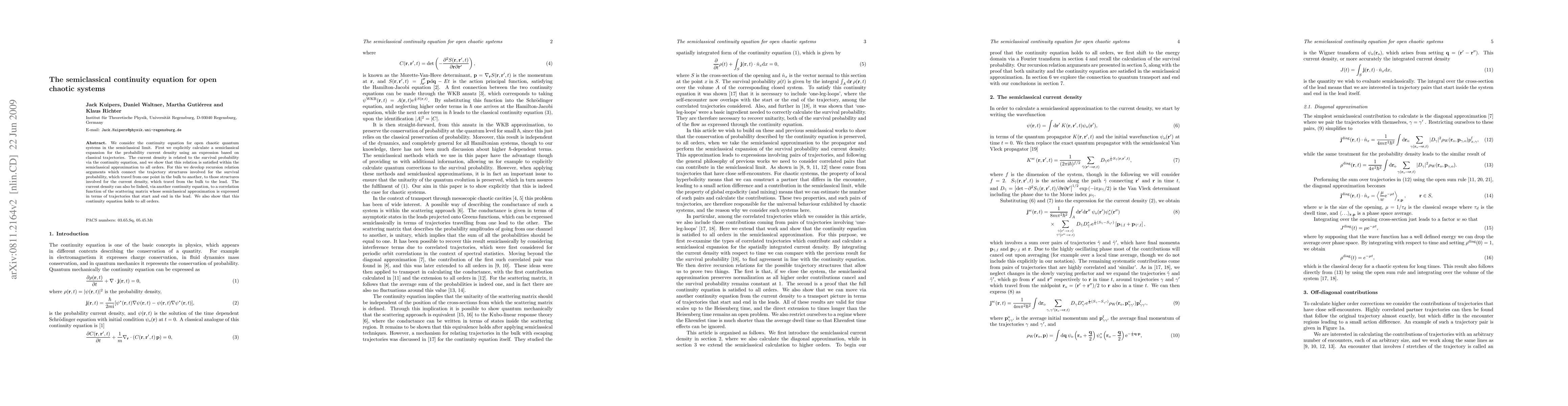 We consider the continuity equation for open chaotic quantum systems in the semiclassical limit. First we explicitly calculate a semiclassical expansion for the probability current density using an expression based on classical trajectories. The current density is related to the survival probability via the continuity equation, and we show that this relation is satisfied within the semiclassical approximation to all orders. For this we develop recursion relation arguments which connect the trajectory structures involved for the survival probability, which travel from one point in the bulk to another, to those structures involved for the current density, which travel from the bulk to the lead. The current density can also be linked, via another continuity equation, to a correlation function of the scattering matrix whose semiclassical approximation is expressed in terms of trajectories that start and end in the lead. We also show that this continuity equation holds to all orders.