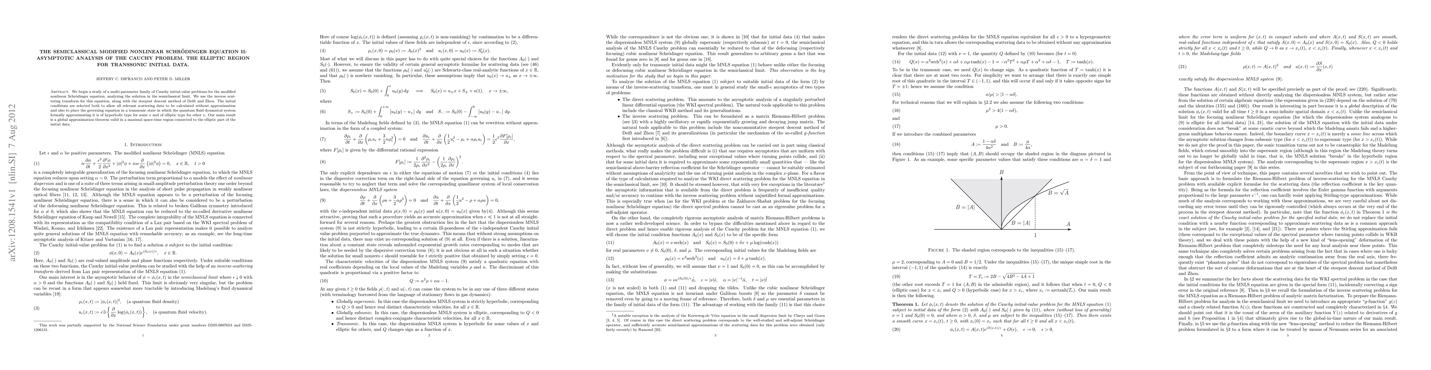 We begin a study of a multi-parameter family of Cauchy initial-value problems for the modified nonlinear Schr\"odinger equation, analyzing the solution in the semiclassical limit. We use the inverse scattering transform for this equation, along with the steepest descent method of Deift and Zhou. The initial conditions are selected both to allow all relevant scattering data to be calculated without approximation and also to place the governing equation in a transsonic state in which the quantum fluid dynamical system formally approximating it is of hyperbolic type for some $x$ and of elliptic type for other $x$. Our main result is a global approximation theorem valid in a maximal space-time region connected to the elliptic part of the initial data.