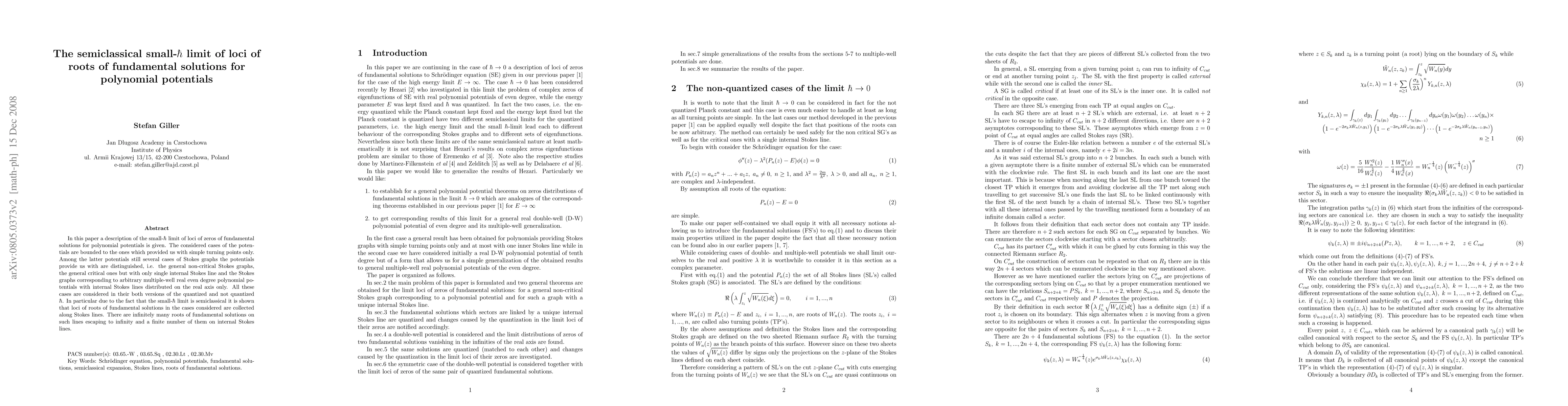 In this paper a description of the small-$\hbar$ limit of loci of zeros of fundamental solutions for polynomial potentials is given. The considered cases of the potentials are bounded to the ones which provided us with simple turning points only. Among the latter potentials still several cases of Stokes graphs the potentials provide us with are distinguished, i.e. the general non-critical Stokes graphs, the general critical ones but with only single internal Stokes line and the Stokes graphs corresponding to arbitrary multiple-well real even degree polynomial potentials with internal Stokes lines distributed on the real axis only. All these cases are considered in their both versions of the quantized and not quantized $\hbar$. In particular due to the fact that the small-$\hbar$ limit is semiclassical it is shown that loci of roots of fundamental solutions in the cases considered are collected along Stokes lines. There are infinitely many roots of fundamental solutions on such lines escaping to infinity and a finite number of them on internal Stokes lines.