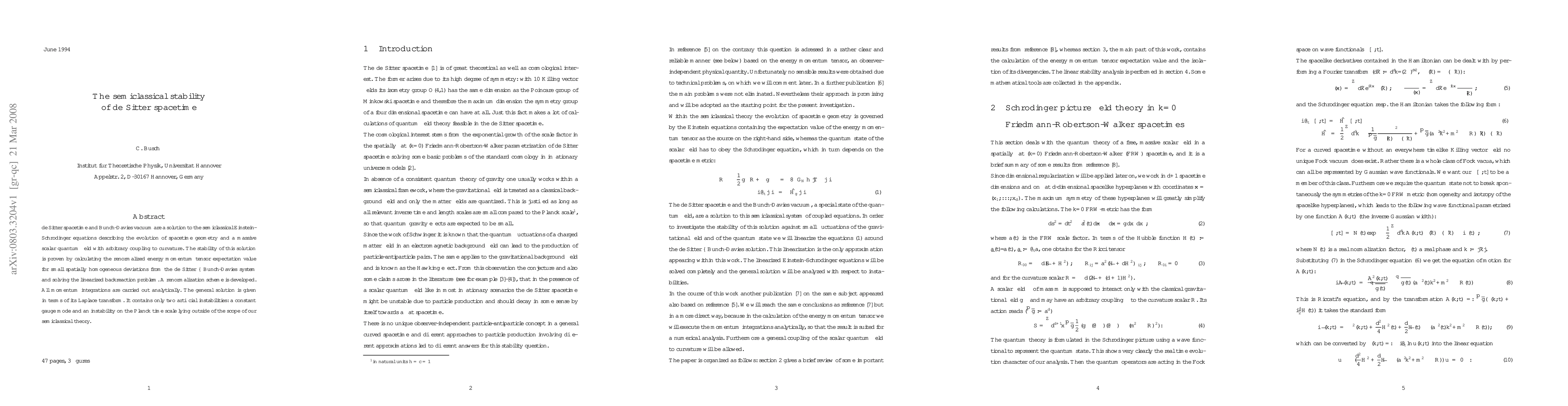 This paper proves the semiclassical stability of de Sitter spacetime by analyzing the linearized backreaction of a massive scalar quantum field on the geometry. The study develops a renormalization scheme and analytically solves the momentum integrals, revealing only two artificial instabilities outside the scope of the semiclassical theory.