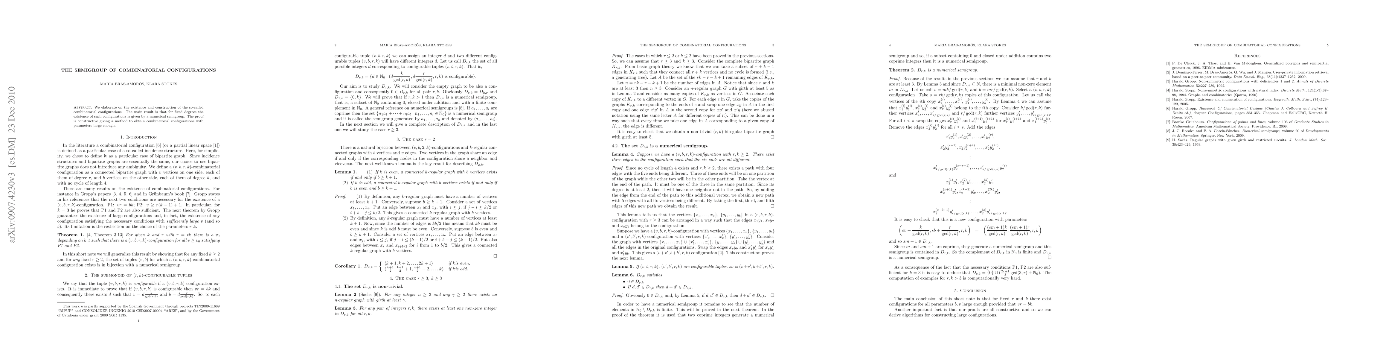 This paper explores (v,b,r,k) combinatorial configurations, which are (r,k)-biregular bipartite graphs without 4-length cycles, important for cryptographic applications. It proves that the set of configurable tuples for fixed r and k forms a numerical semigroup, with complete descriptions provided for r=2 and r=3.