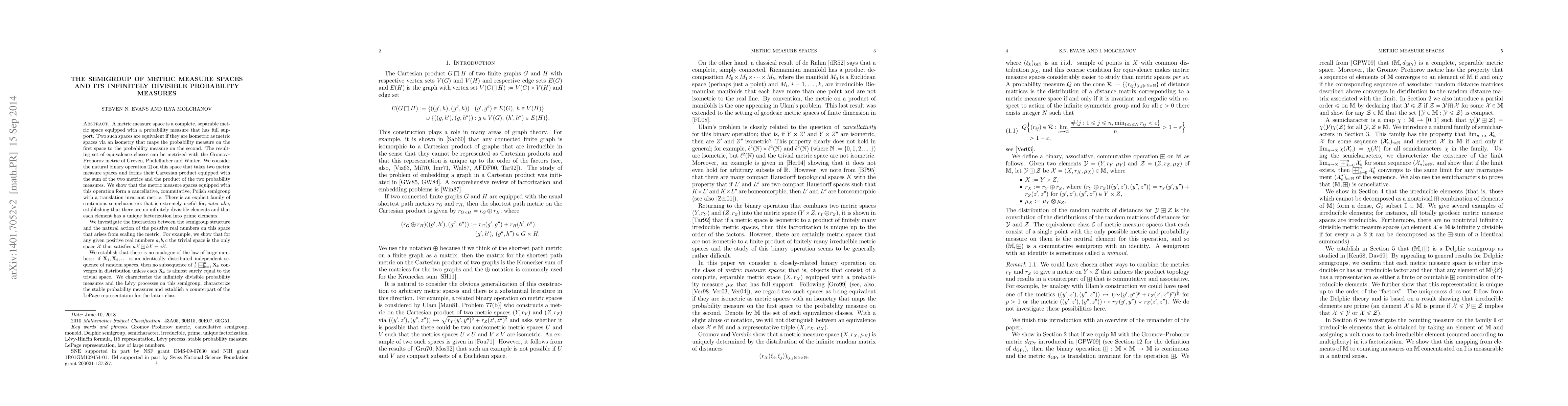 A metric measure space is a complete separable metric space equipped with probability measure that has full support. Two such spaces are equivalent if they are isometric as metric spaces via an isometry that maps the probability measure on the first space to the probability measure on the second. The resulting set of equivalence classes can be metrized with the Gromov-Prohorov metric of Greven, Pfaffelhuber and Winter. We consider the natural binary operation $\boxplus$ on this space that takes two metric measure spaces and forms their Cartesian product equipped with the sum of the two metrics and the product of the two probability measures. We show that the metric measure spaces equipped with this operation form a cancellative, commutative, Polish semigroup with a translation invariant metric and that each element has a unique factorization into prime elements. We investigate the interaction between the semigroup structure and the natural action of the positive real numbers on this space that arises from scaling the metric. For example, we show that for any given positive real numbers $a,b,c$ the trivial space is the only space $\mathcal{X}$ that satisfies $a \mathcal{X} \boxplus b \mathcal{X} = c \mathcal{X}$. We establish that there is no analogue of the law of large numbers: if $\mathbf{X}_1, \mathbf{X}_2$..., is an identically distributed independent sequence of random spaces, then no subsequence of $\frac{1}{n} \boxplus_{k=1}^n \mathbf{X}_k$ converges in distribution unless each $\mathbf{X}_k$ is almost surely equal to the trivial space. We characterize the infinitely divisible probability measures and the L\'evy processes on this semigroup, characterize the stable probability measures and establish a counterpart of the LePage representation for the latter class.