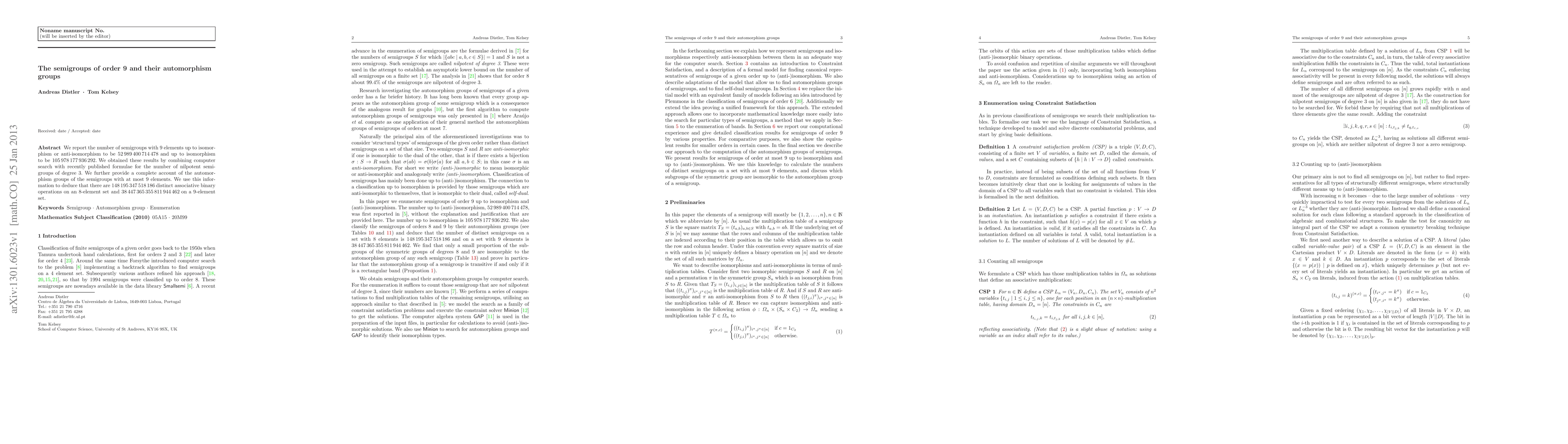 We report the number of semigroups with 9 elements up to isomorphism or anti-isomorphism to be 52,989,400,714,478 and up to isomorphism to be 105,978,177,936,292. We obtained these results by combining computer search with recently published formulae for the number of nilpotent semigroups of degree 3. We further provide a complete account of the automorphism groups of the semigroups with at most 9 elements. We use this information to deduce that there are 148,195,347,518,186 distinct associative binary operations on an 8-element set and 38,447,365,355,811,944,462 on a 9-element set.