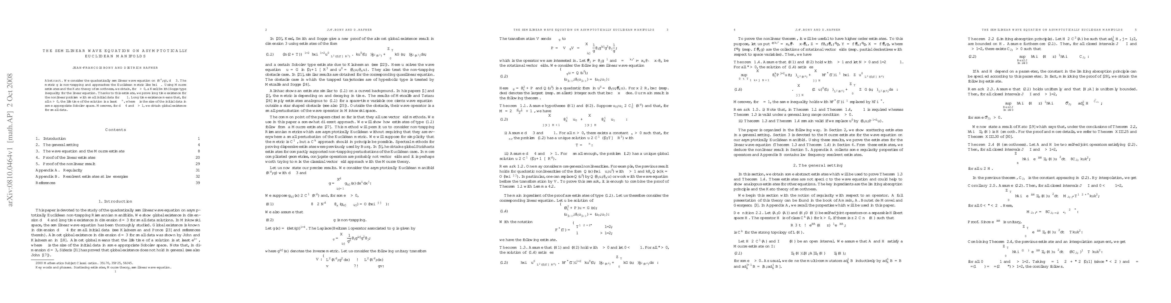 This paper investigates the quadratically semilinear wave equation on asymptotically Euclidean manifolds, proving long-time existence for d=3 and global existence for d>3 using Mourre estimates and Kato theory, supported by a Keel-Smith-Sogge type inequality.