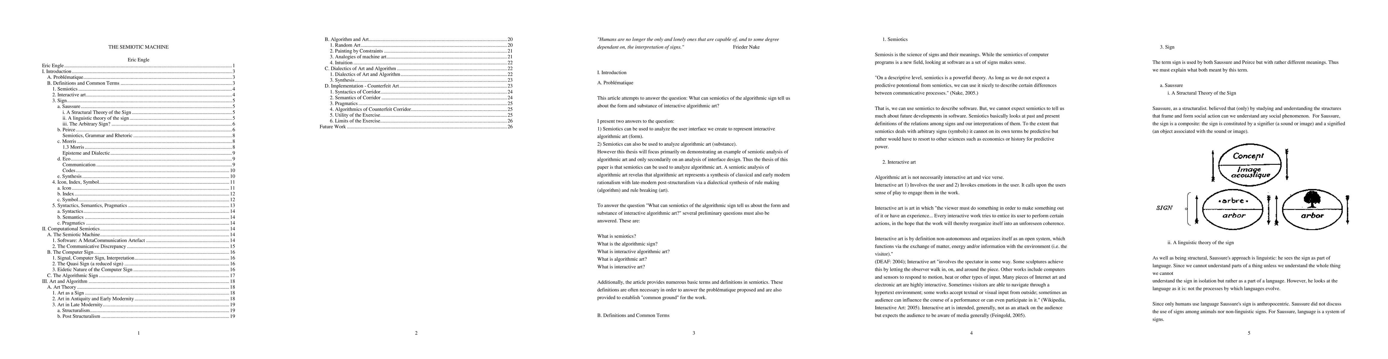 Summary: This paper proposes a semiotic model for user interfaces in human-computer interaction, emphasizing algorithmic signs and the role of semantics in algorithmic art, to enhance the understanding and design of interactive systems.