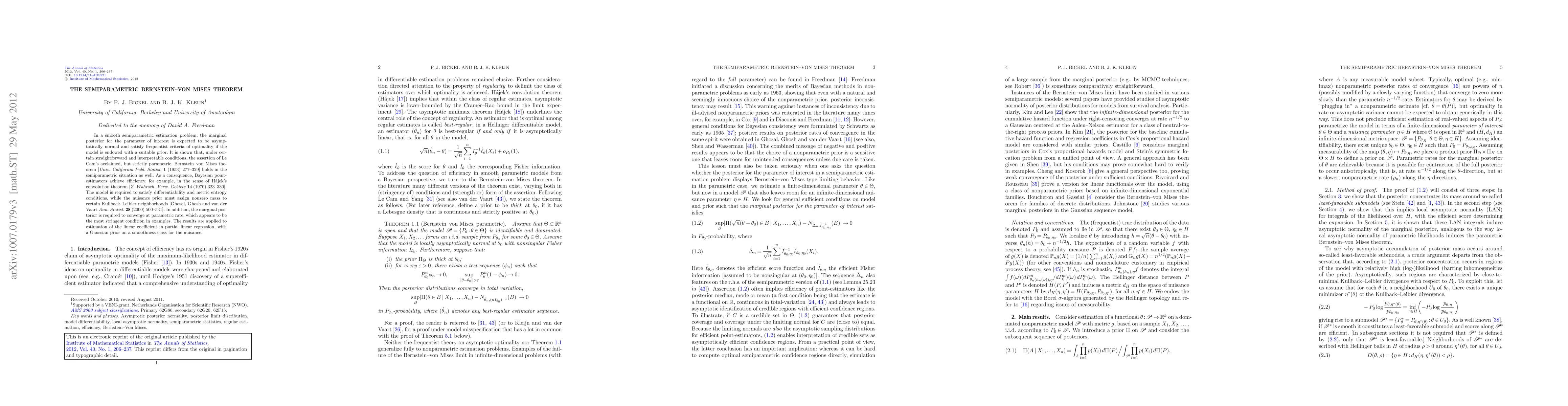 This paper extends the Bernstein-von Mises theorem to semiparametric models, demonstrating that under specific conditions, the marginal posterior for the parameter of interest is asymptotically normal and optimal. The results are applied to partial linear regression, showing Bayesian estimators' efficiency.
